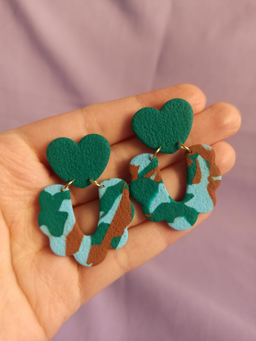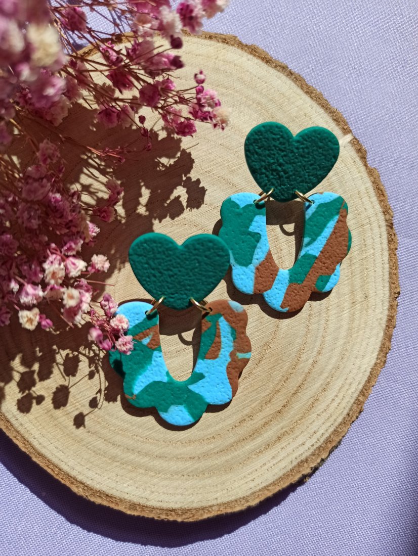 Kolczyki wiszące sztyfty szmaragdowe serca połączone z łukiem w marmurkowy wzór w kolorach szmaragdowej zieleni, błękitu i ciepłego brązu.