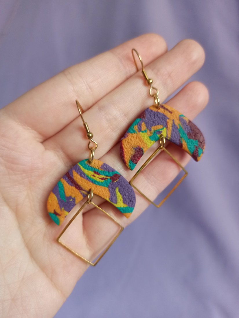 Kolczyki wiszące z gliny polimerowej w kolorowe ciapki/ efekt marmurkowy. Z ozdobnym złotym kwadratem ze stali szlachetnej.