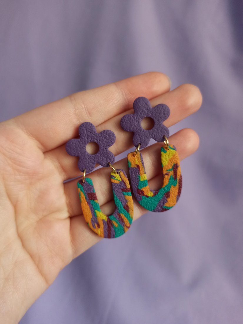 Kolczyki wiszące z gliny polimerowej na fioletowym sztyfcie w kształcie kwiatka z odwróconym łukiem w kolorowe ciapki/ efekt marmurkowy.