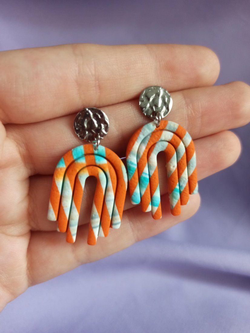 Kolczyki wiszące łuki w kolorowe pasy z ozdobnym srebrnym gniecionym sztyftem.