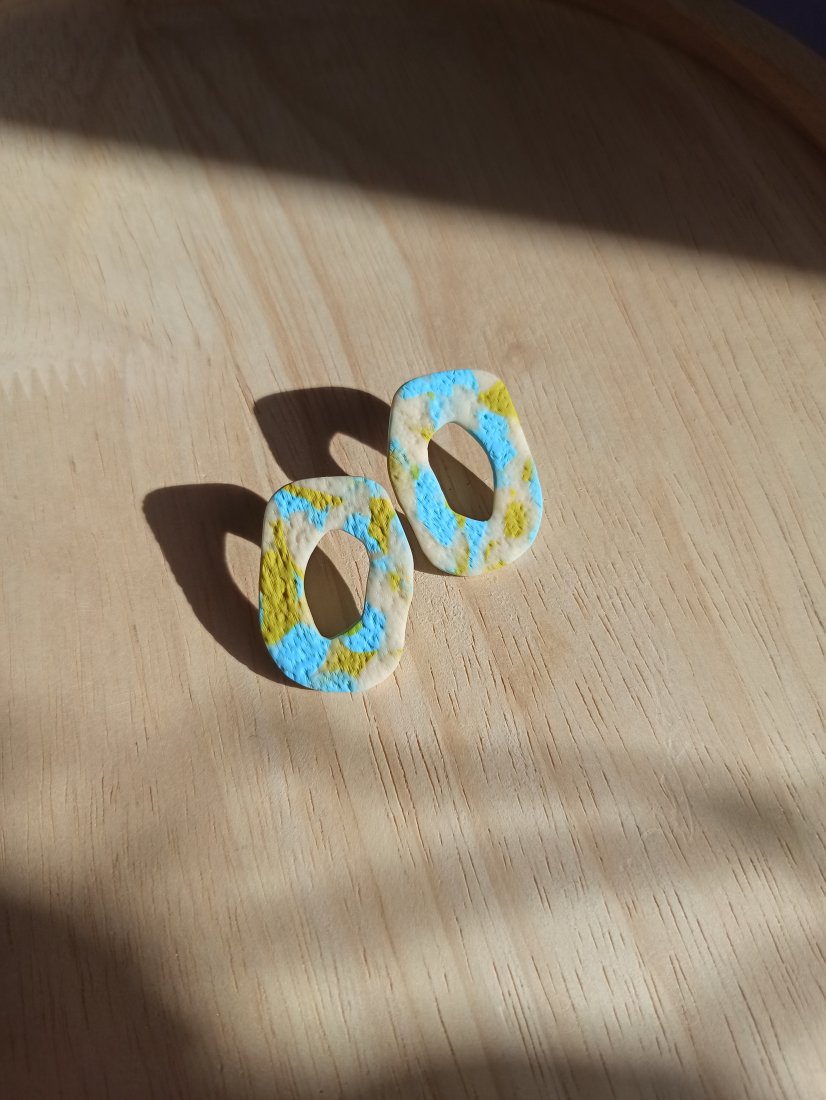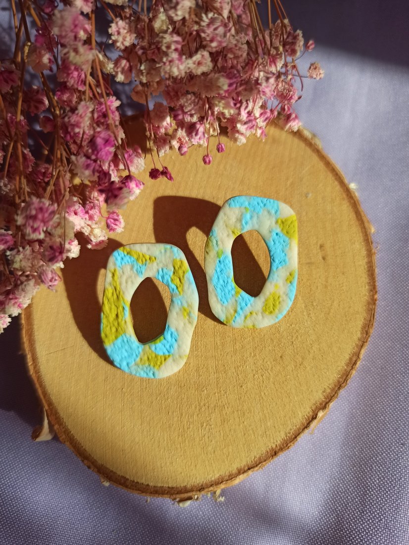 Kolczyki wykonane z gliny polimerowej, lekkie i wytrzymałe. Bigle/ kółka ze stali chirurgicznej.