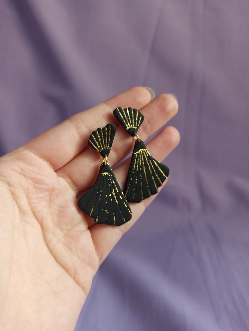 Eleganckie kolczyki w kolorze czarnym z elementami złotej folii. Kształt zbliżony do liści miłorzębu japońskiego.