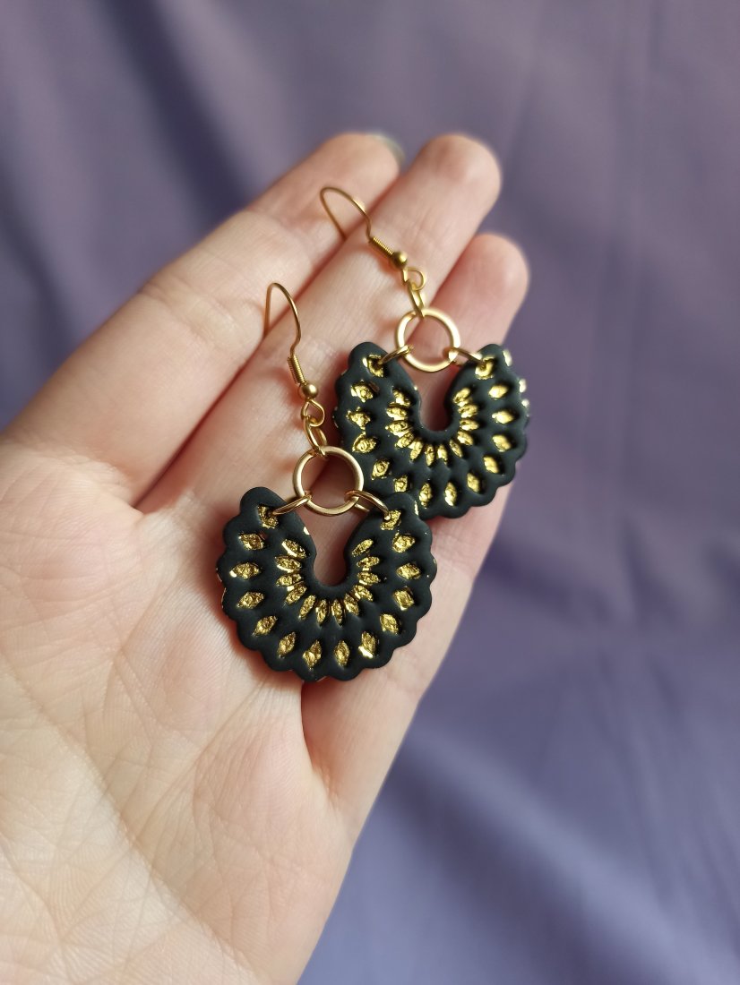 Eleganckie kolczyki w kolorze czarnym z elementami złotej folii. Kształt półokrągły ze żłobieniami.