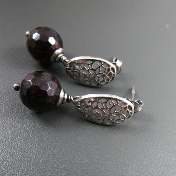 Kolczyki wykonane z fasetowanych kul granatu 10 mm. Całość oprawiona w srebro 925, oksydowane i wypolerowane, w tym ażurowy akcent. Długość kolczyków wynosi ok. 30 mm. Zapięcie typu sztyft. Elegancko zapakowane.