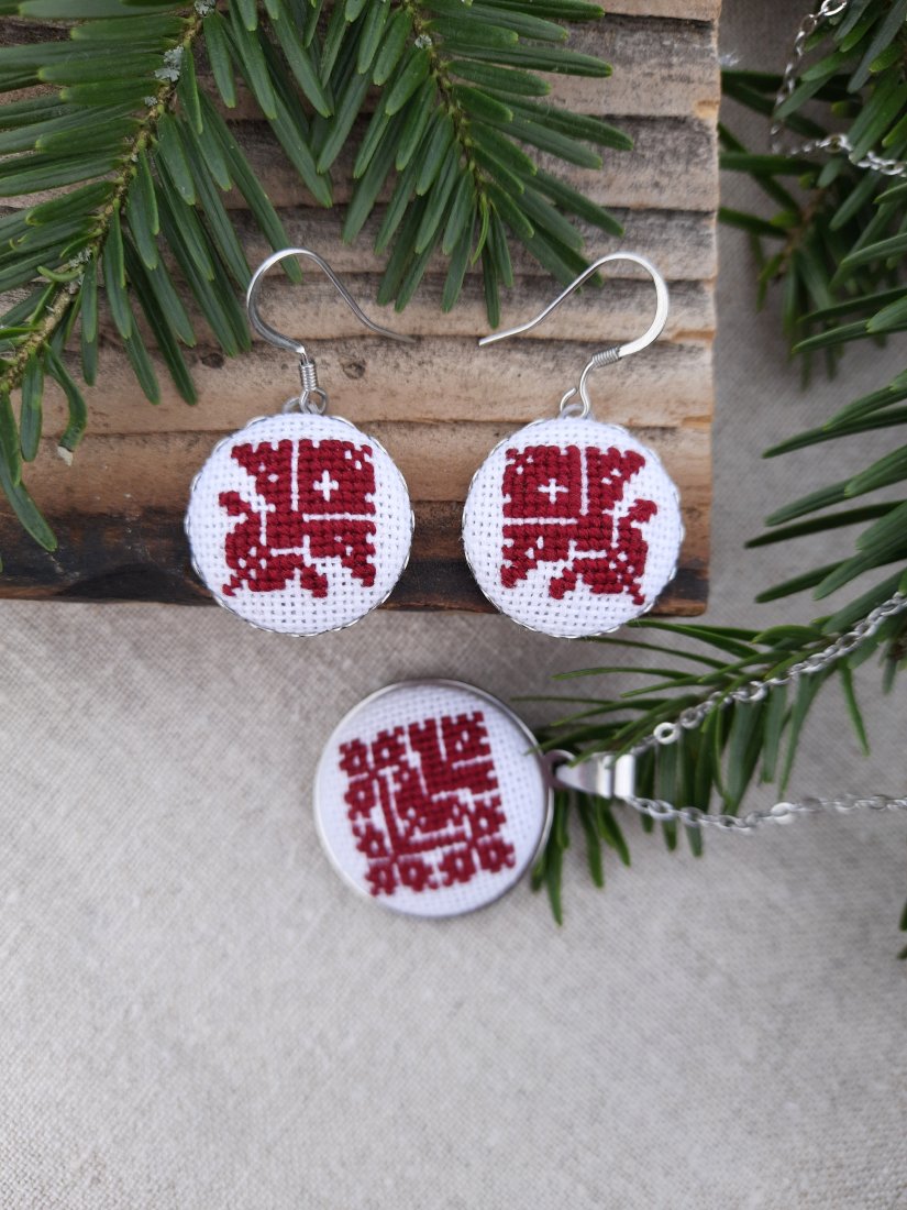 Kolczyki ze słowiańskim haftem krzyżykowym. Haft wykonałam ręcznie na bawełnianej tkaninie w kolorze białym.