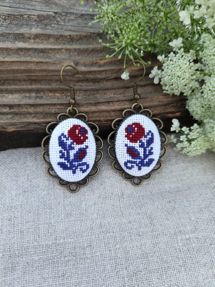 Kolczyki z ukraińskim haftem krzyżykowym w kolorze bordowo-granatowym. Haft wykonałam ręcznie na bawełnianej kanwie w kolorze białym.