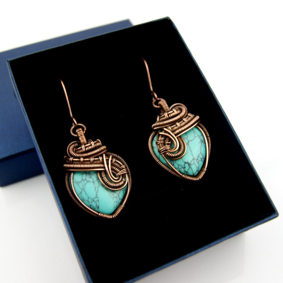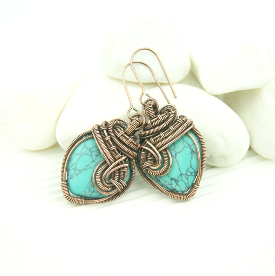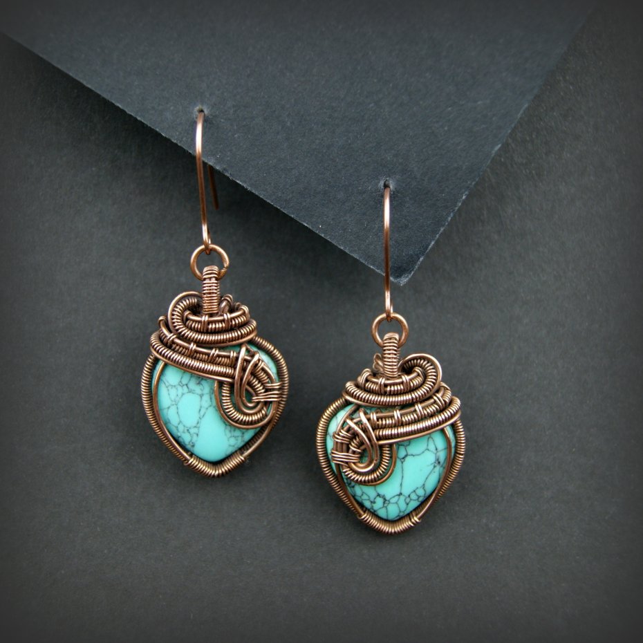 Wiszące kolczyki w całości wykonane z miedzi. Podstawą kolczyków są kamienie howlitu w kształcie serduszek. Kamienie otrzymały misternie plecioną, miedzianą oprawę. Bigle miedziane. Biżuteria wykonana techniką wire wrapping, oksydowana.