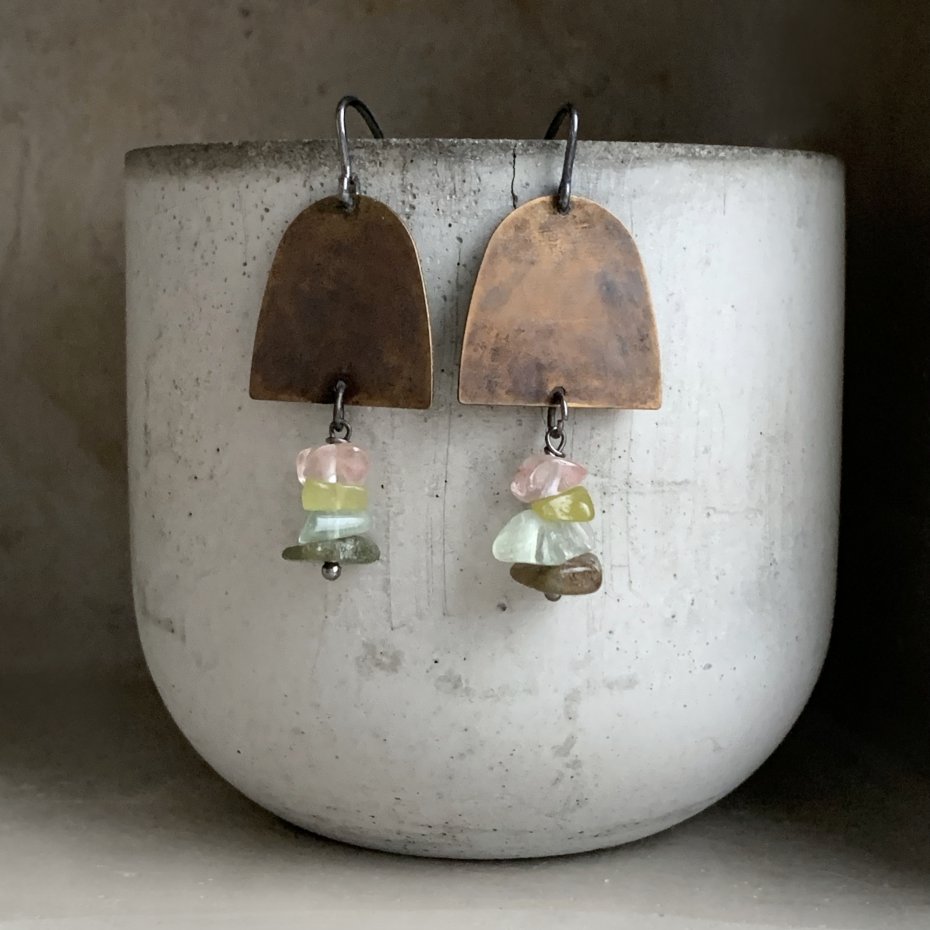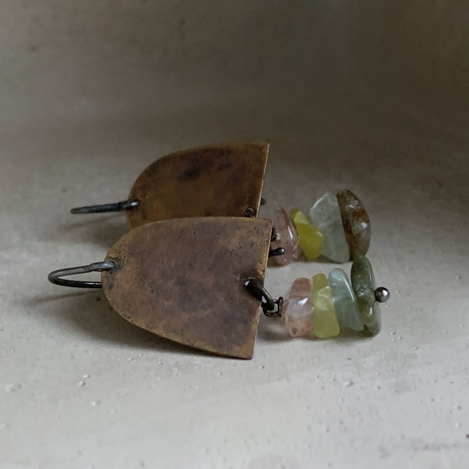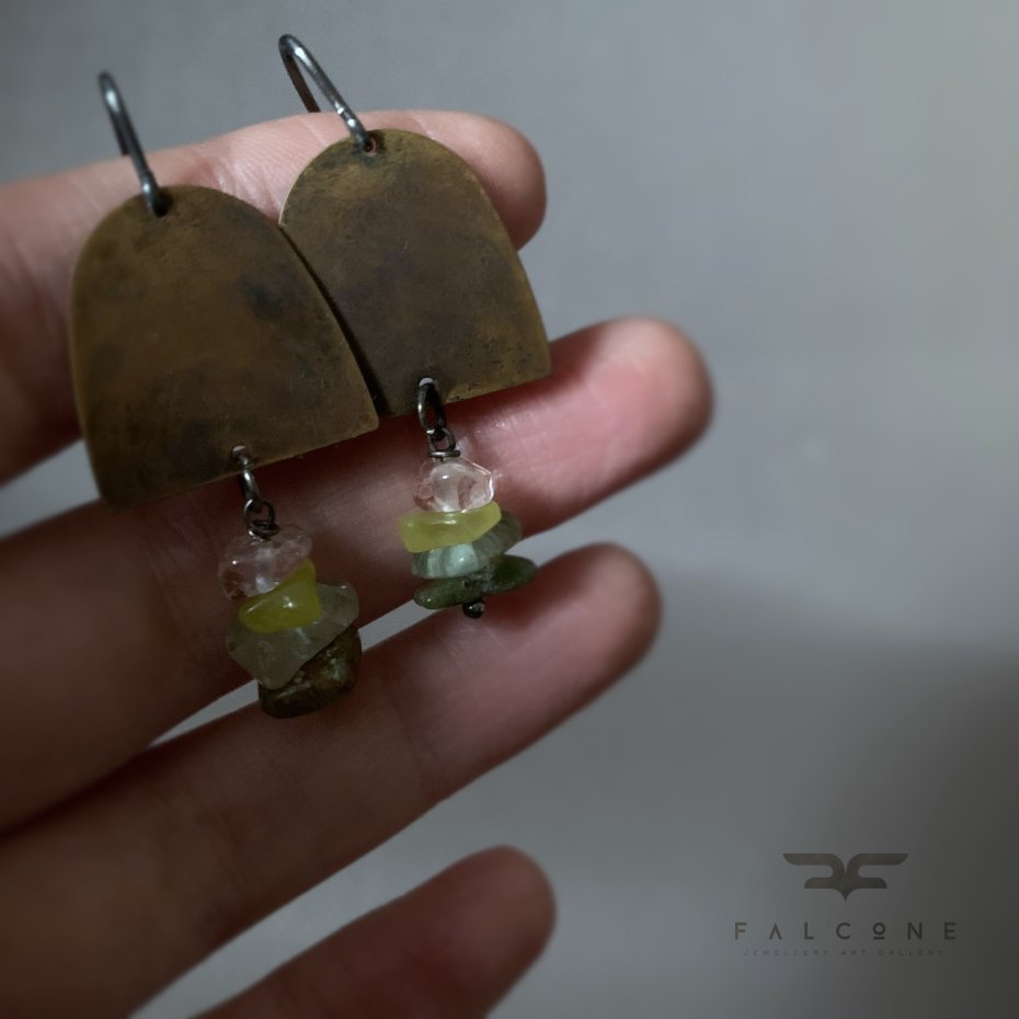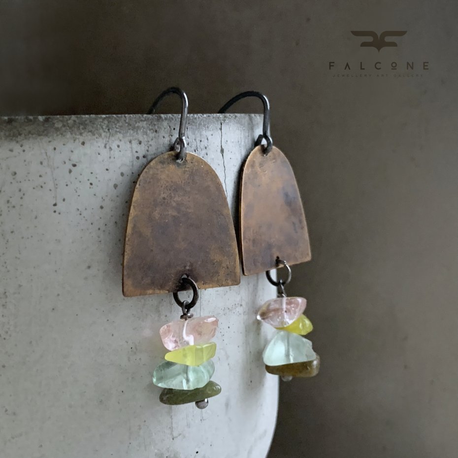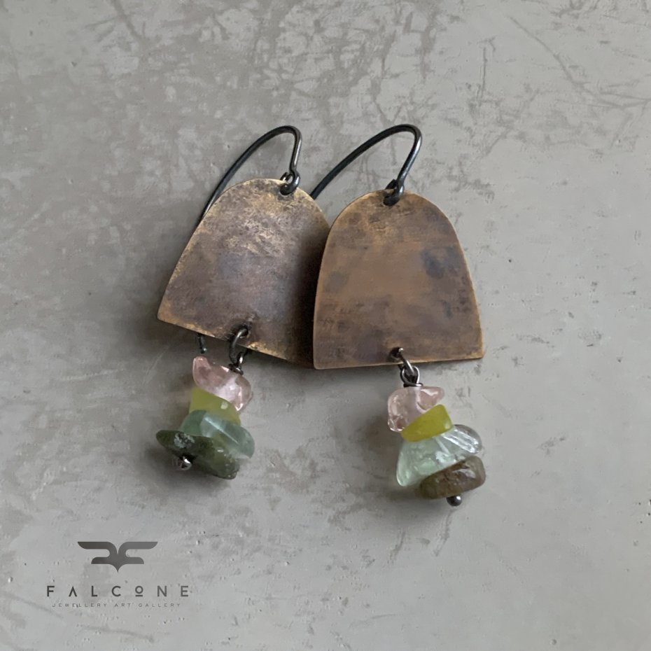 Kolczyki ze srebra, mosiądzu i kamieni. Oksydowane na ciemny kolor srebro i mosiądz z subtelnym efektem patyny, stanowią oprawę dla surowych kamieni. Nieregularne bryłki kwarcu różowego z kwarcem żółtym, fluorytem i agatem, posiadają naturalne nierówności i ubytki na powierzchni. Blada, pastelowa barwa kamieni, w połączeniu z brązową, nierównomierną patyną, tworzą unikalną kompozycję, odzwierciedlającą barwy natury. Bigle typu haki z oksydowanego srebra 925. Wielkość kamieni to ok. 6 mm / 10 mm. Szerokość kolczyków to ok. 2 cm. Kolczyki maja długość ok. 4,5 cm.