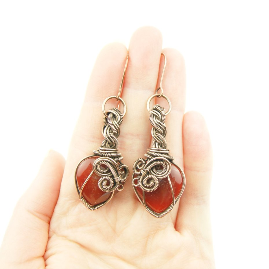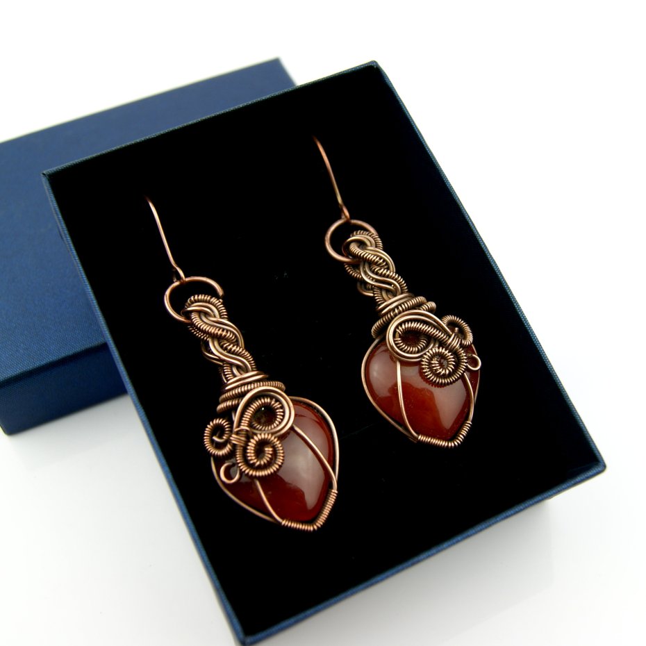 Wiszące kolczyki w całości wykonane z miedzi. Podstawą kolczyków są kamienie karneolu w kształcie serduszek. Kamienie otrzymały misternie plecioną, miedzianą oprawę. Bigle miedziane. Biżuteria wykonana techniką wire wrapping, oksydowana.