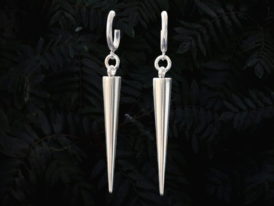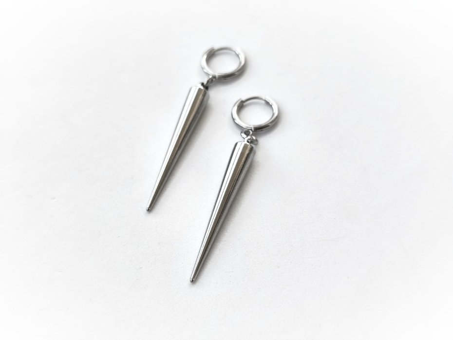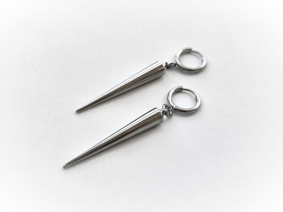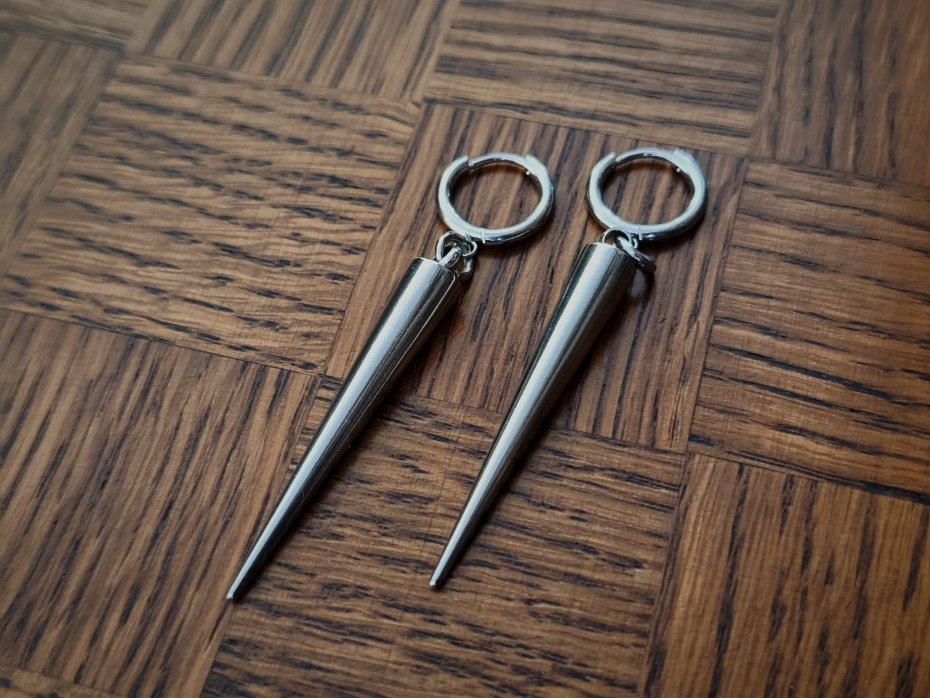 Agresywne, ostre kolczyki z długimi kolcami ze stali nierdzewnej – czysty, surowy design bez zbędnych ozdób. Solidne, błyszczące szpikulce wiszą na gęstym splotcie chainmaille z ogniwek ze stali chirurgicznej 316L. Bigle stal chirurgiczna – wygodne, bezpieczne i hipoalergiczne. Całość daje ten ciężki, metaliczny klimat – jak fragment dystopijnej zbroi albo talizman na mroczne noce.