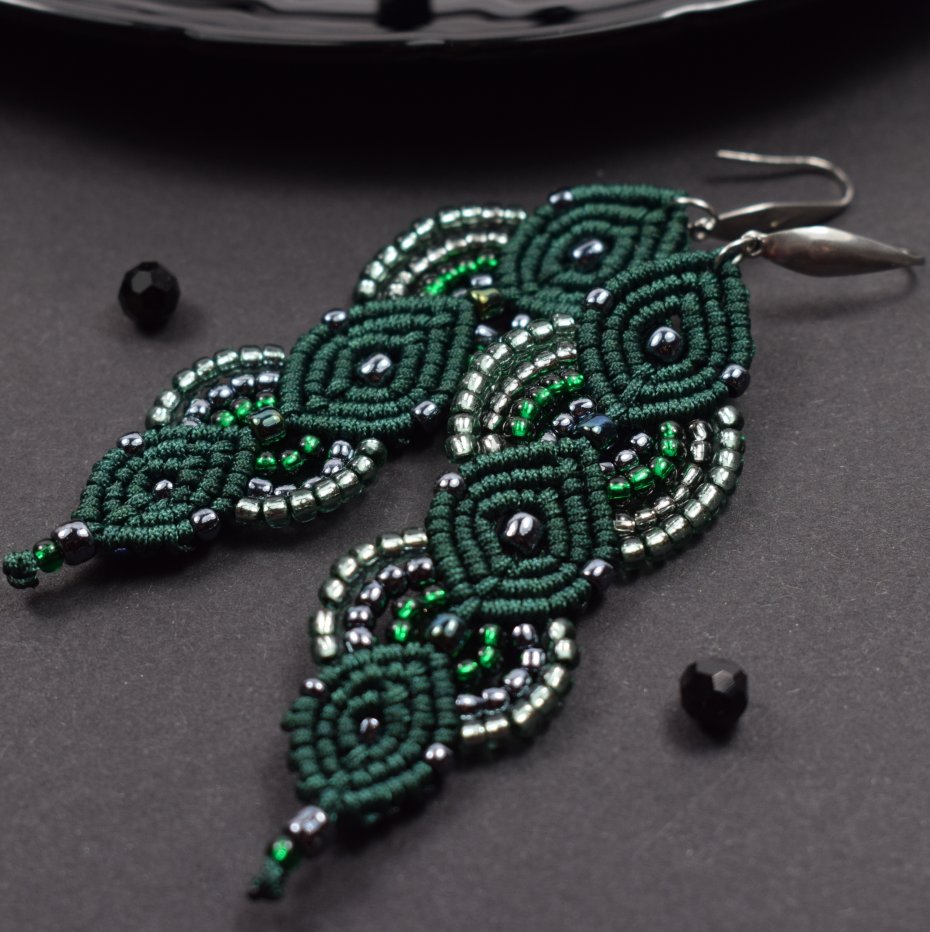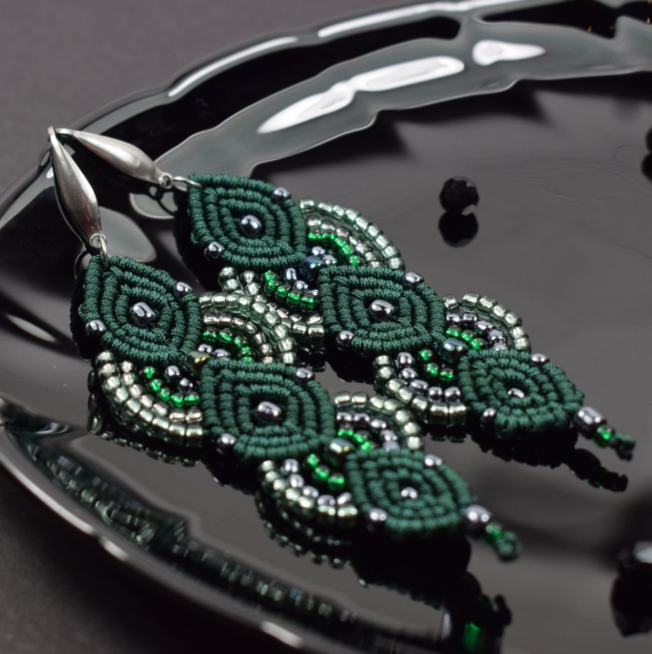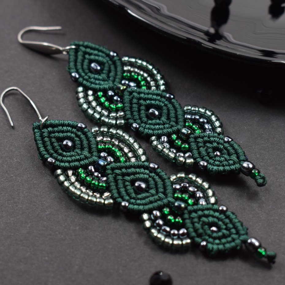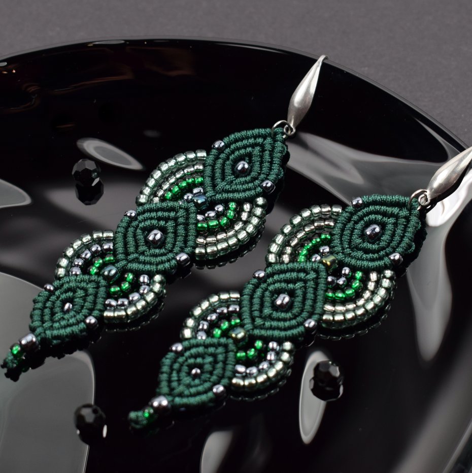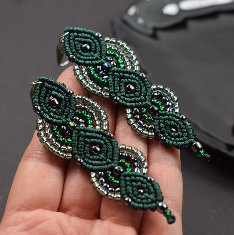 Ręcznie wykonane kolczyki stworzone techniką makramy z profesjonalnego sznurka w głębokim, butelkowym odcieniu zieleni. Ozdobione drobnymi koralikami w tonacjach srebra, szmaragdu i zieleni, które pięknie odbijają światło, nadając im subtelnego blasku i elegancji.