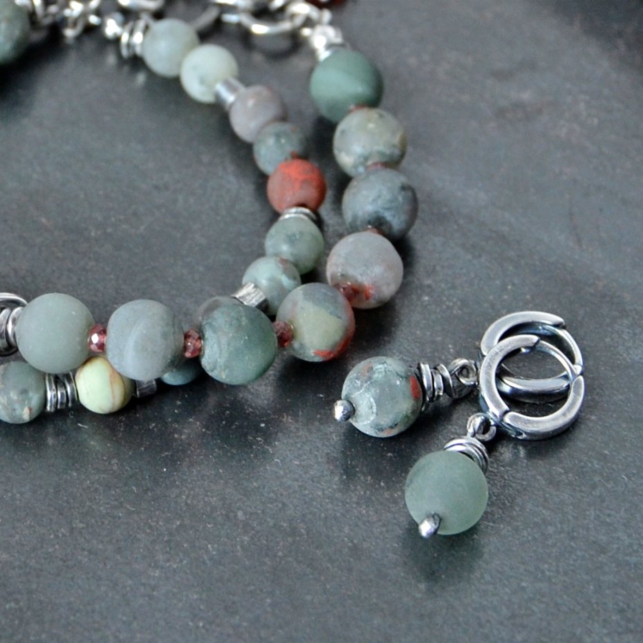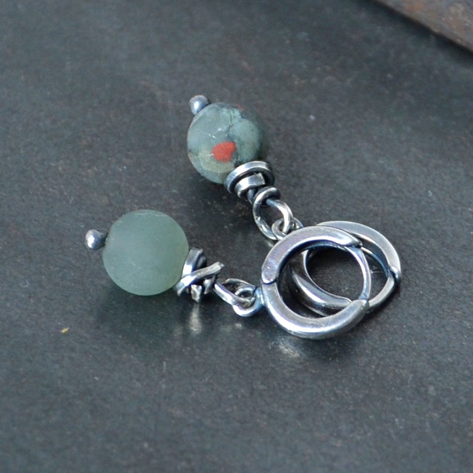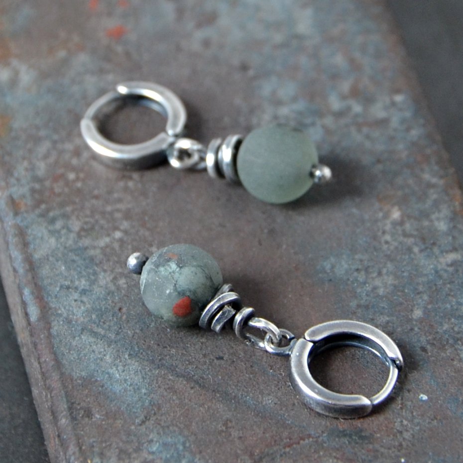 Kolczyki wykonane z pojedynczej kuli naturalnego heliotropu (krwawnika) i oksydowanego srebra