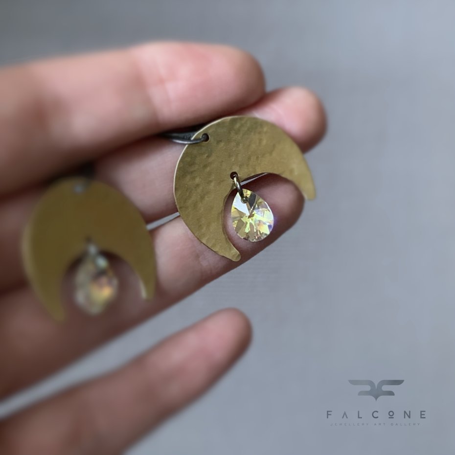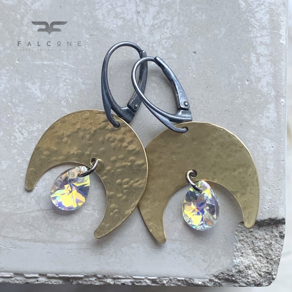 Kolczyki ze srebra, mosiądzu i kryształów Swarovskiego. Księżyc z mosiądzu w kolorze złota, o kutej, repusowanej powierzchni, ozdobiony kryształkiem Swarovskiego. Kryształ w postaci łezki, o barwie "Crystal AB" (Aurora Borealis), jest przejrzysty z efektem zorzy polarnej. Bigle angielskie ze srebra 925. Wielkość kryształów to 8 mm. Szerokość kolczyków to ok. 2,5 cm. Długość kolczyków to ok. 4 cm.