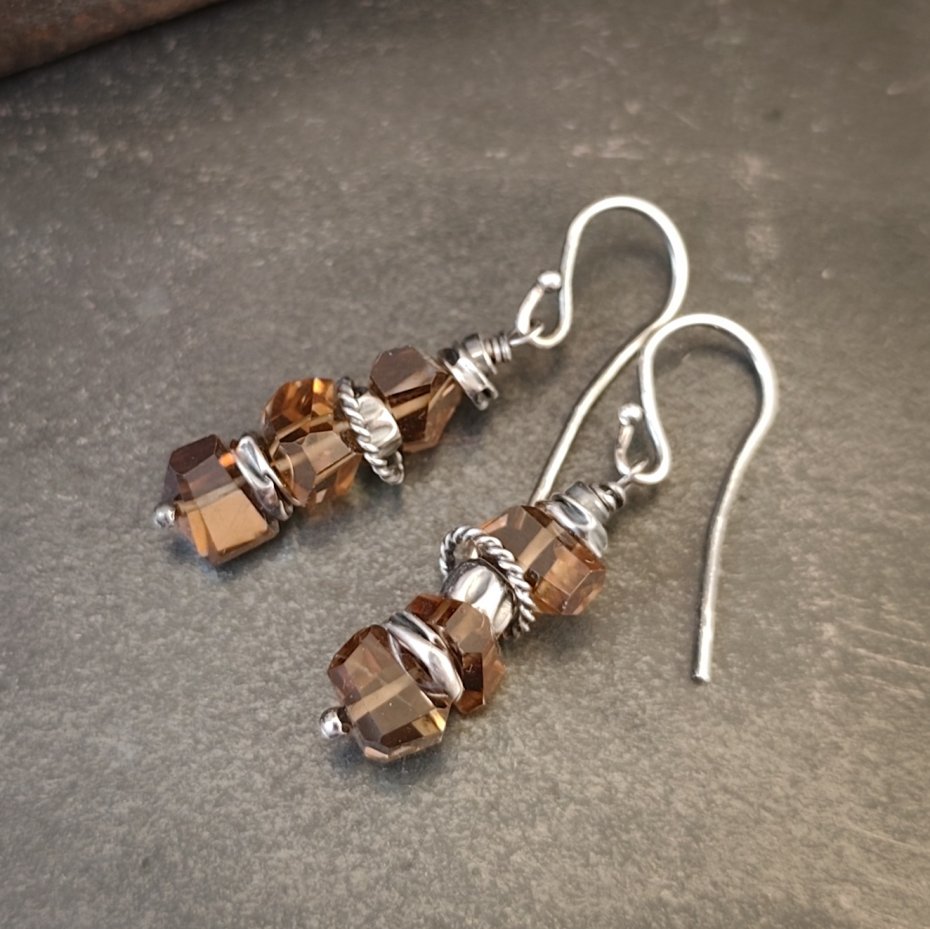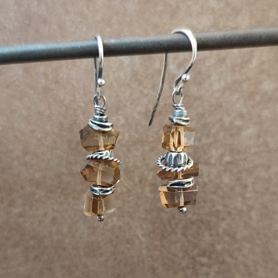 W tych kolczykach główną rolę odgrywają miodowe kwarce, o nieregularnym kształcie, ciekawej złocistej barwie, pięknie załamujące światło. Pozostałe elementy zostały wykonane z ręcznie formowanych elementów srebrnych.