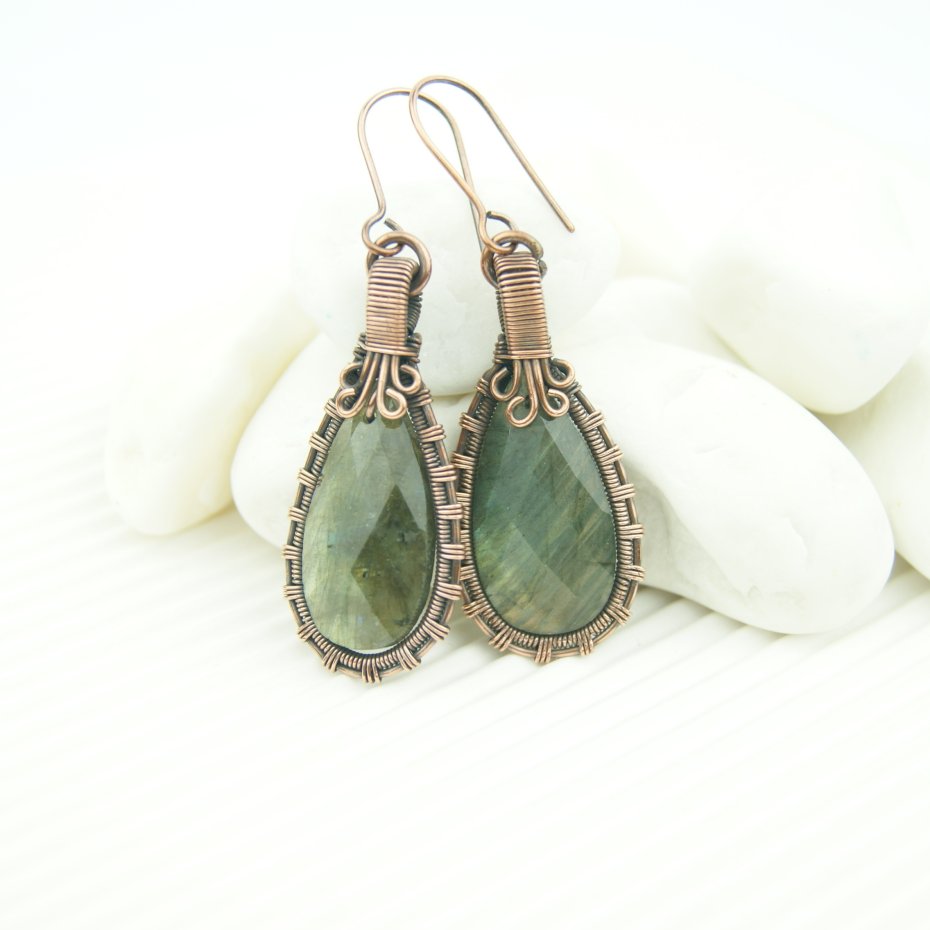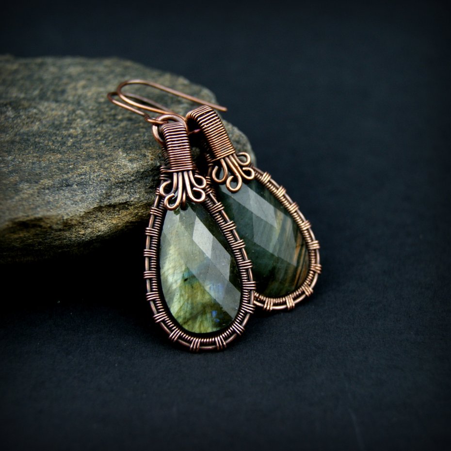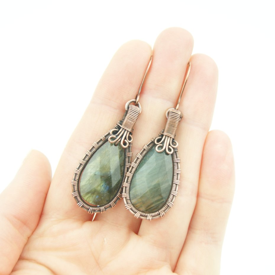 Wiszące kolczyki w całości wykonane z miedzi. Podstawę kolczyków są fasetowane kamienie labradorytu, całość misternie opleciona miedzią. Biżuteria oksydowana.
