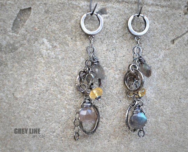 Długie kolczyki wykonane z oksydowanego i polerowanego srebra próby 925, w tym ręcznie robionych kół średnicy 13 i 16 mm, w połączeniu z wysokiej klasy labradorytami o pięknej niebieskiej poświacie oraz fasetowanymi oponkami cytrynów.