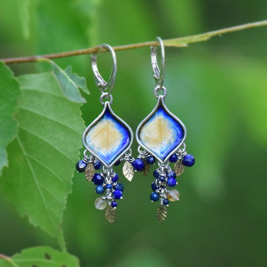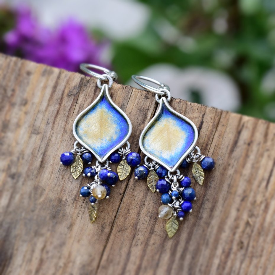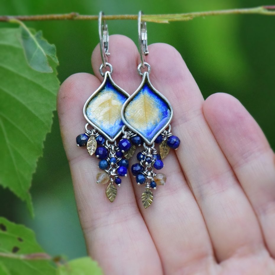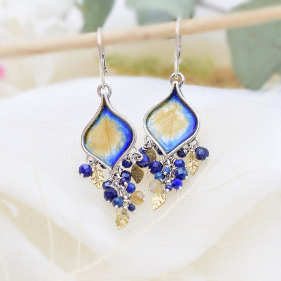 Delikatne, ręcznie wykonane kolczyki inspirowane baśniowym ogrodem. Główny element w kształcie liścia pokryty jest barwną emalią jubilerską, która pięknie kontrastuje z kiścią niebieskich lapisów lazuli i złotymi listkami z mosiądzu. Całość dopełnia subtelny akcent cytrynu.