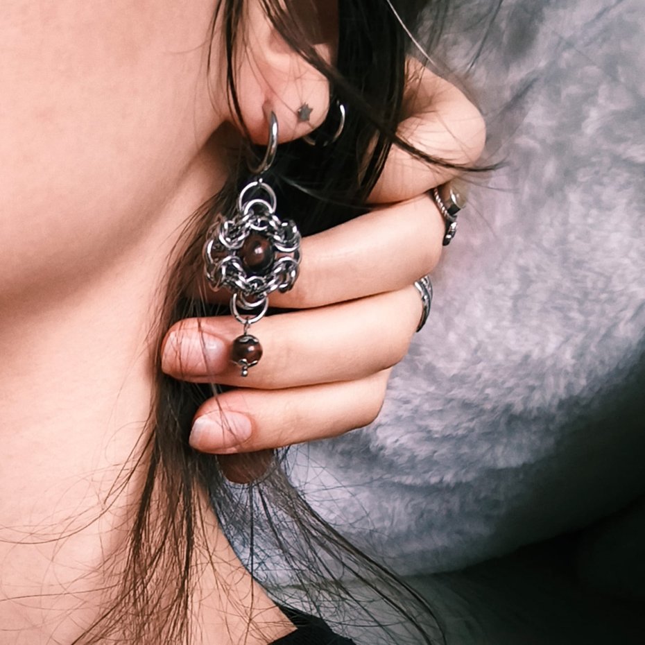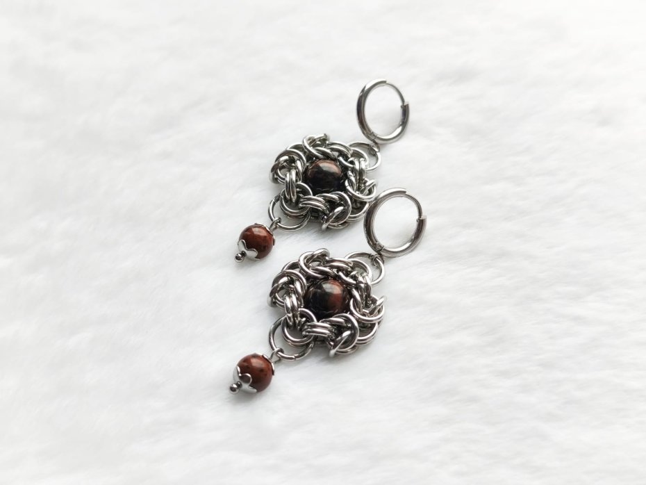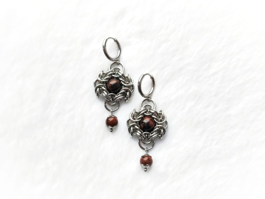 Ciepłe, ziemiste kolczyki ręcznie robione z naturalnym kamieniem mahoniowym (Mahogany Obsidian) w centrum chainmaille. Głęboki brązowo-czerwony odcień kamienia przypomina mahoń, a wisząca kuleczka dodaje uroku i ruchu.