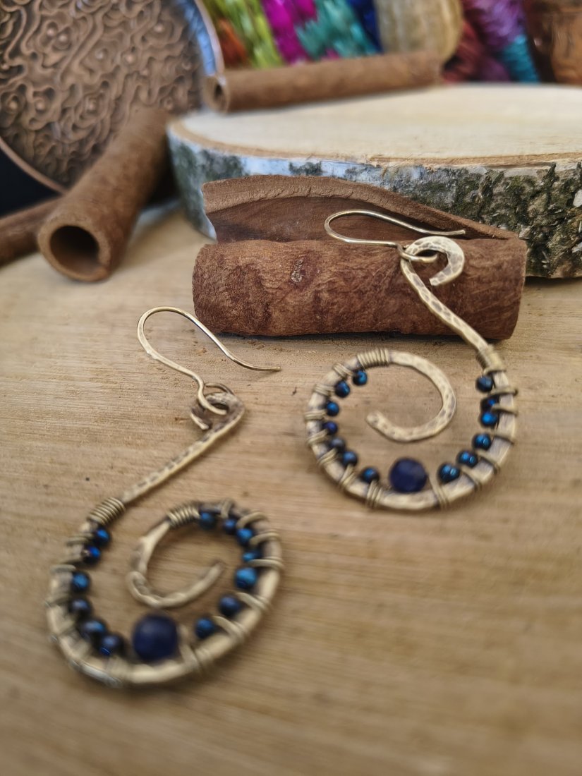 Wykonane z mosiądzu i kamieni naturalnych - hematytów. Młotkowane i oksydowane. Polecam serdecznie