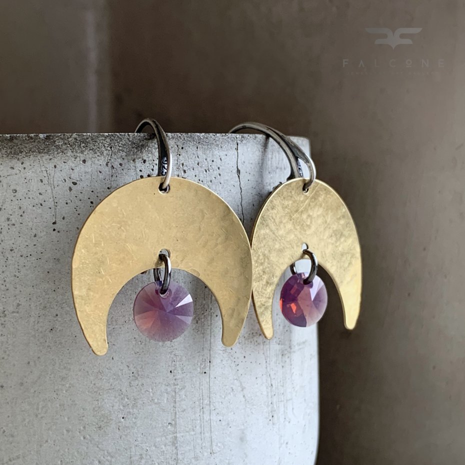 Kolczyki ze srebra, mosiądzu i kryształów Swarovskiego. Mosiądz o barwie złota, w formie kutych, repusowanych księżyców ozdobiony kryształkiem Swarovskiego. Kryształ w postaci dysków, lekko przejrzysty, w kolorze pomiędzy wrzosem, a różem z efektem opalizacji. Srebro oksydowane i przetarte dla podkreślenia barwy kryształów. Bigle angielskie ze srebra 925. Wielkość kryształów to 8 mm. Szerokość kolczyków to ok. 2,5 cm. Długość kolczyków to ok. 4 cm.