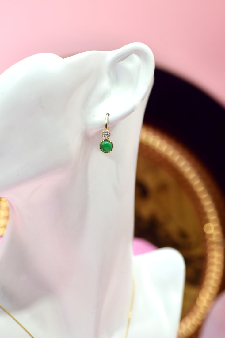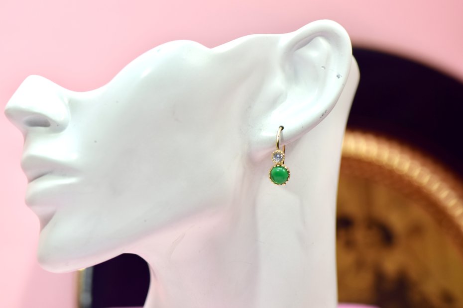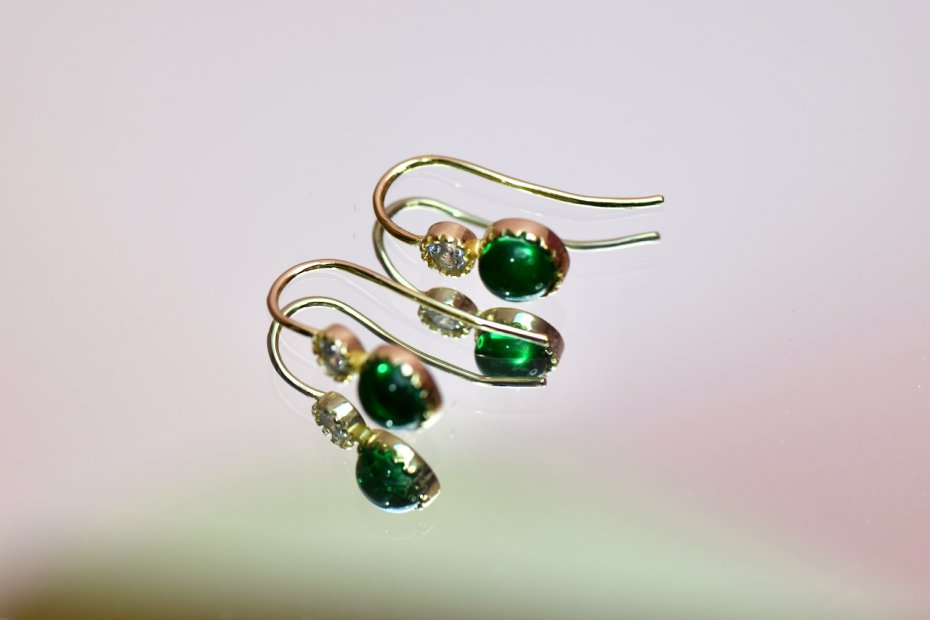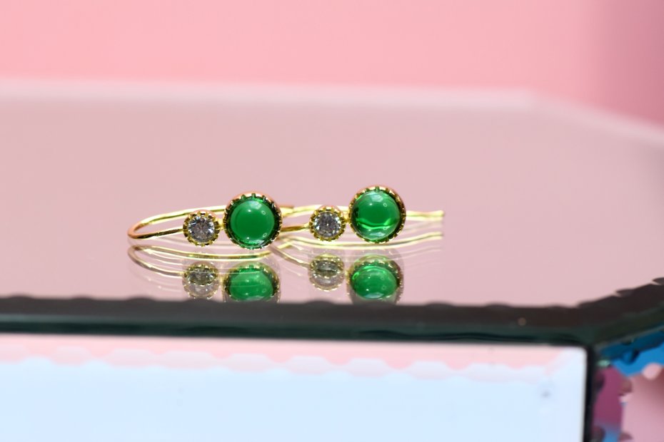 Kolczyki ozdobione są kamieniem o szmaragdowej barwie w szlifie kaboszonu.