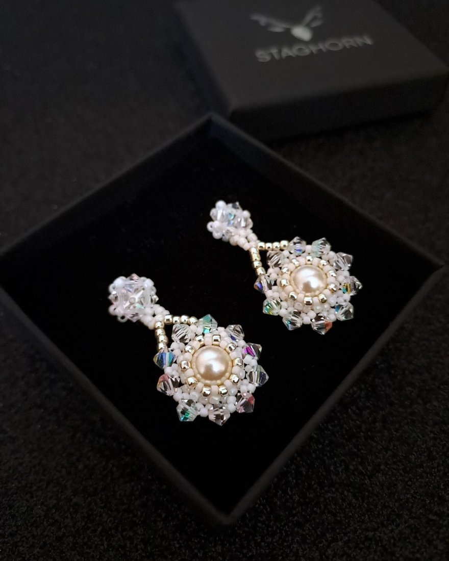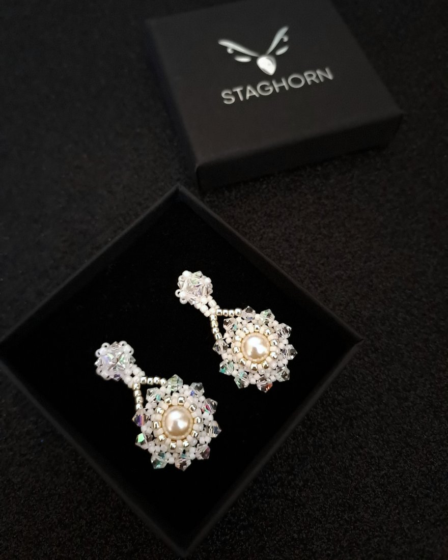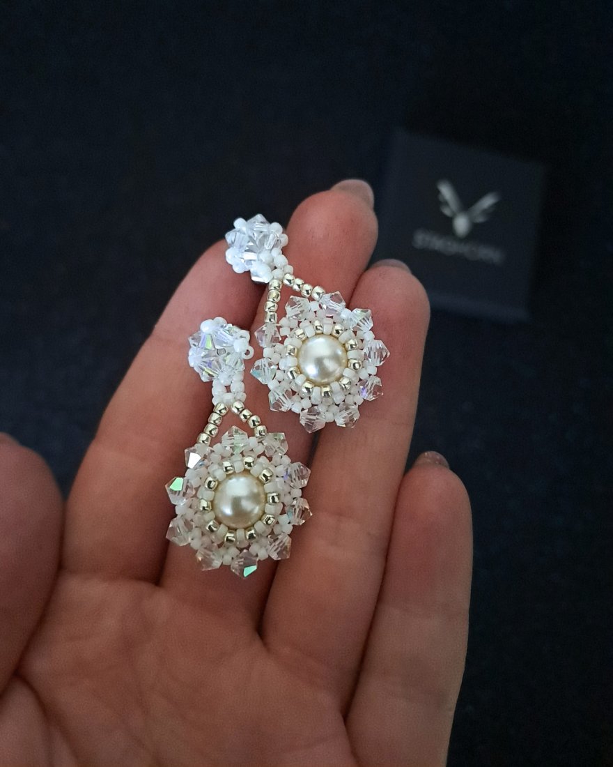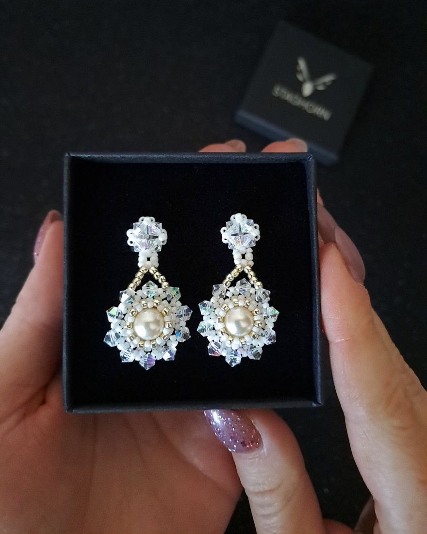 Poszukujesz biżuterii, która doda blasku i podkreśli wyjątkowy charakter Twojej ślubnej stylizacji? Kolczyki z perełkami to idealny wybór dla panny młodej, która pragnie subtelnej elegancji i ręcznie wykonanych detali. Główne elementy kolczyków stanowią piękne perełki Preciosa, otoczone delikatnymi, połyskującymi kryształkami w odcieniu Crystal AB, które mienią się przy każdym ruchu. Białe i srebrne koraliki dodają całości harmonii, tworząc klasyczny, a zarazem nowoczesny efekt, który doskonale komponuje się z różnymi stylami - od romantycznych, przez minimalistyczne, po bardziej ozdobne kreacje.