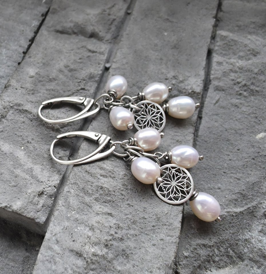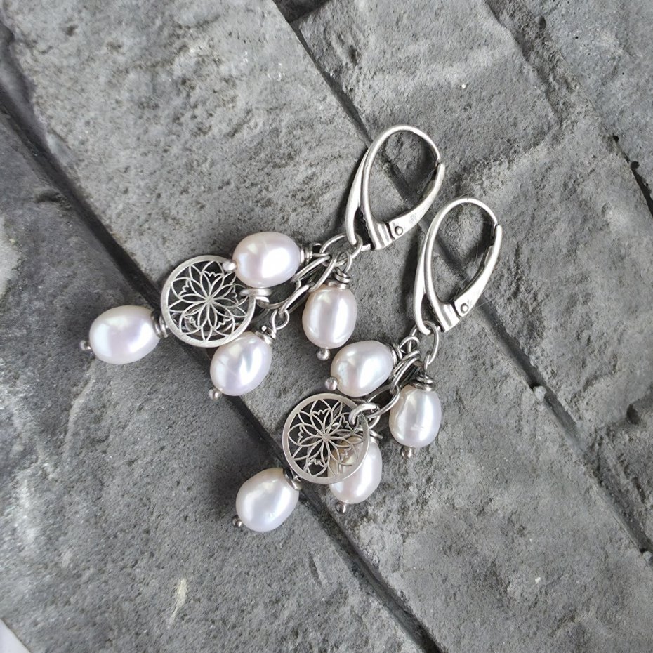 Subtelne, kobiece kolczyki dla kobiet lubiacych bizuterie z perłami. Wykonane w całości z oksydowanego srebra próby 925 oraz pereł słodkowodnych wielkości ok. 0,7-0,8 cm. Srebrne rozetki są wielkości 1 cm. Całkowita długość kolczyków to 5 cm. Ozdobnie zapakowane.