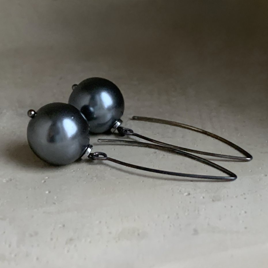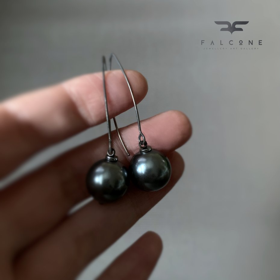 Kolczyki ze srebra i szklanych pereł. Duże, efektowne perłowe kule w kolorze chłodnej szarości, w oprawie ze srebra. Kule zawieszone na długich biglach. Bigle typu rybki ze srebra 925. Średnica kul to ok. 14 mm. Długość kolczyków to ok. 5 cm.