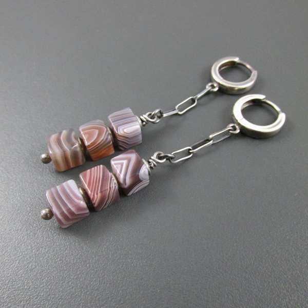 Kolczyki wykonane z sześcianów agatu botswana ok. 6 mm. Całość oprawiona w srebro 925, oksydowane i wypolerowane. Długość całkowita kolczyków wynosi ok. 58 mm. Elegancko zapakowane.