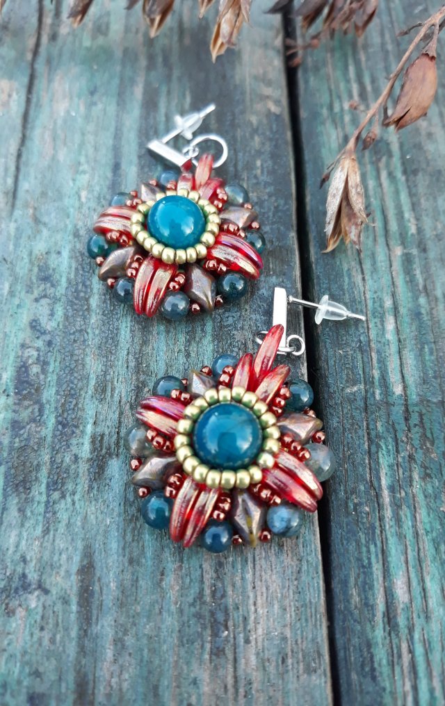 ,,kolczyki z turmalinem,, to delikatne kolczyki wykonane z niebieskiego turmalinu oplecionego szklanymi koralikami i kryształkami w różnych odcieniach czerwieni, złota, a także ze złotego hematytu. Kolczyki zawieszone są na ozdobnych biglach typu sztyft wykonanych ze stali szlachetnej.