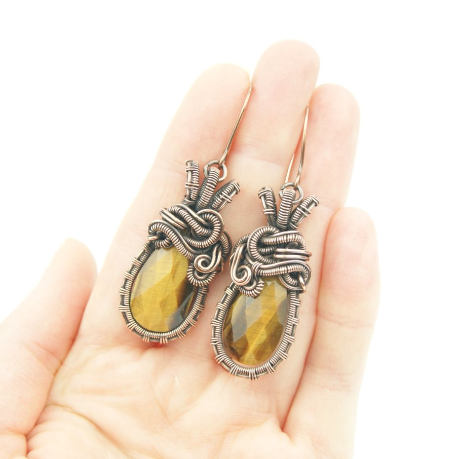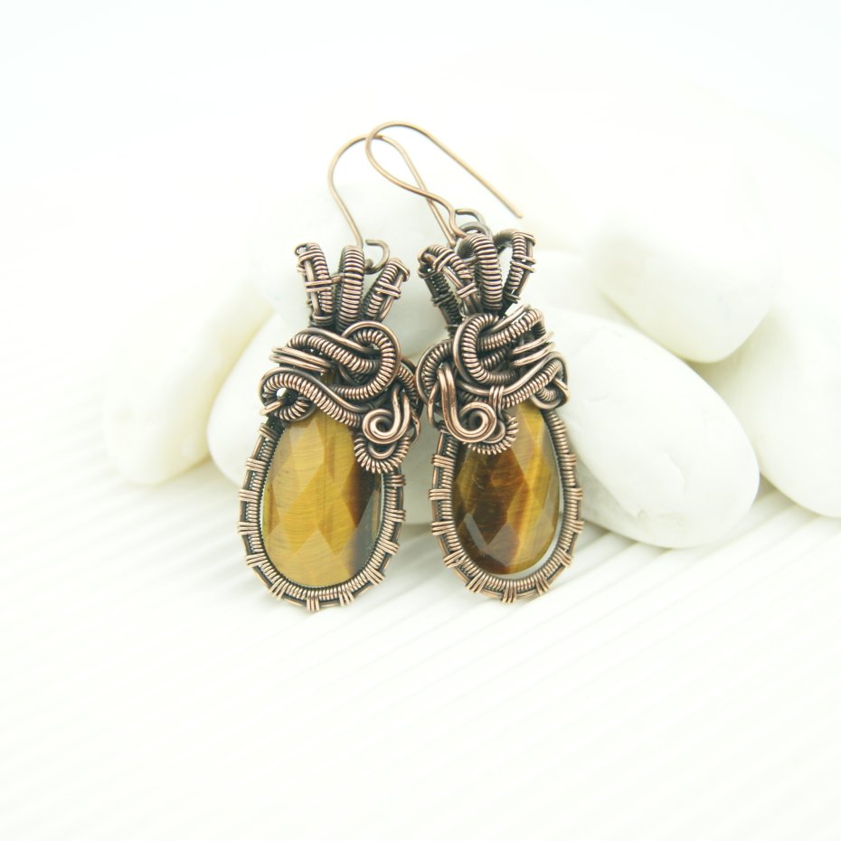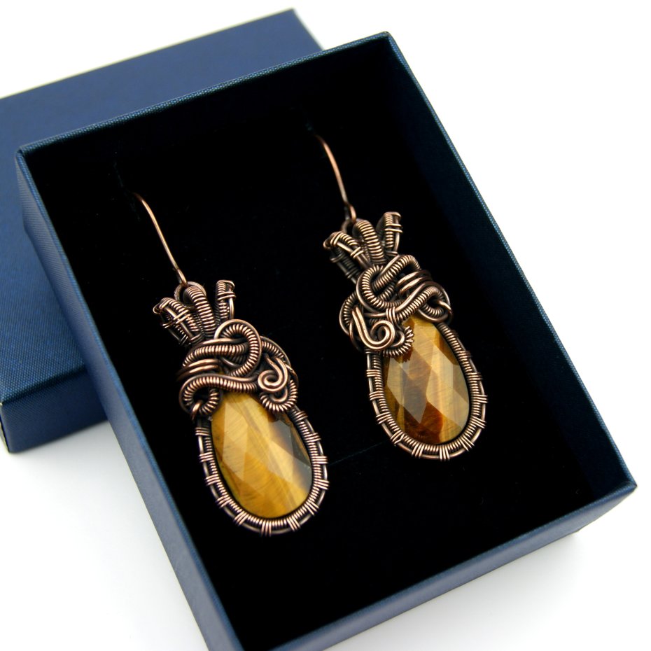Wiszące kolczyki w całości wykonane z miedzi. Podstawę kolczyków są fasetowane kamienie tygrysiego oka, całość misternie opleciona miedzią. Biżuteria oksydowana.