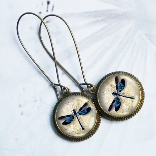 Kolczyki z oryginalną grafiką, zatopioną pod wypukłym szkiełkiem ( tzw. szklanym kaboszonem dającym delikatny efekt trójwymiarowości) i oprawioną w hipoalergiczną bazę w kolorze antycznego złotego brązu. Grafika jest najwyższej jakości, bardzo wyraźna i nasycona. Duże bigle z metalu antyalergicznego w kolorze antycznego złotego brązu.