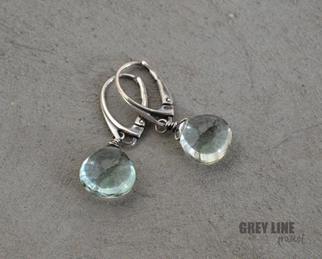 Proste kolczyki wykonane ze srebra próby 925, oksydowanego i przecieranego oraz dużej gładkiej briolettki naturalnego zielonego ametystu.
