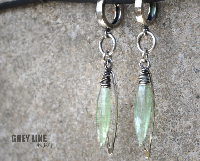 Kolczyki wykonane ze srebra próby 925 i 930, oksydowanego i przecieranego oraz naturalnego zielonego kyanitu w formie włóczni.