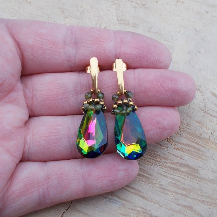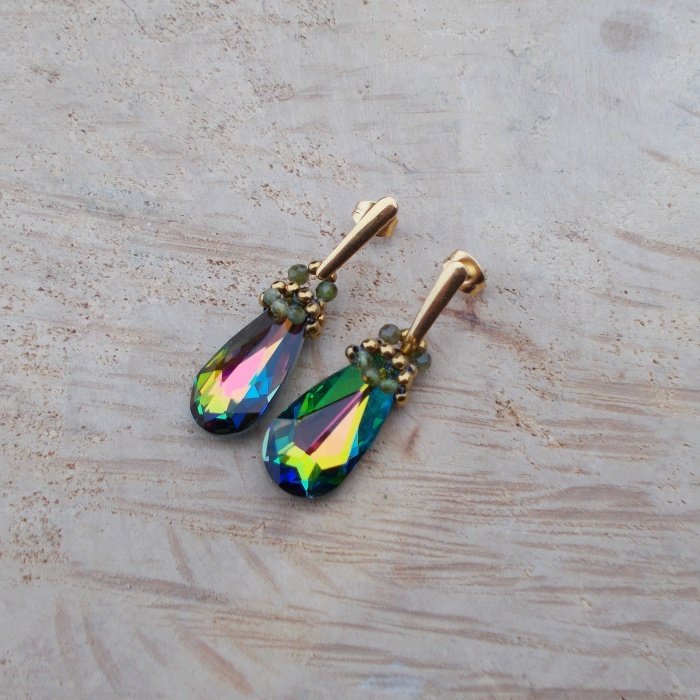 Eleganckie, kobiece kolczyki wykonane ze stali chirurgicznej w kolorze złotym, kryształów Swaroskiego w kolorze zielonym z wielokolorową poświatą, zielonych turmalinów i hematytów. Zawieszone na sztyftach, zatyczki w komplecie.
