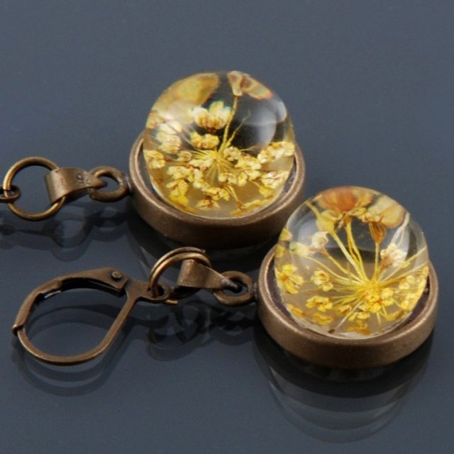 Oryginalne i urocze kolczyki, wykonane są z obręczy wewnątrz których znajdują się kule z żywicy z zatopionymi kwiatkami . Kula działa jak szkło powiększające, a kwiatki znajdują się na dnie.