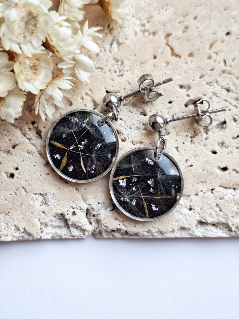 Urocze kolczyki w kształcie kółka z zatopionymi nasionami dmuchawca i płatkami srebra na czarnym, błyszczącym tle. Wykonane z wysokiej klasy żywicy, która nie zmienia koloru pod wpływem promieniowania UV oraz wysokiej jakości stali chirurgicznej.