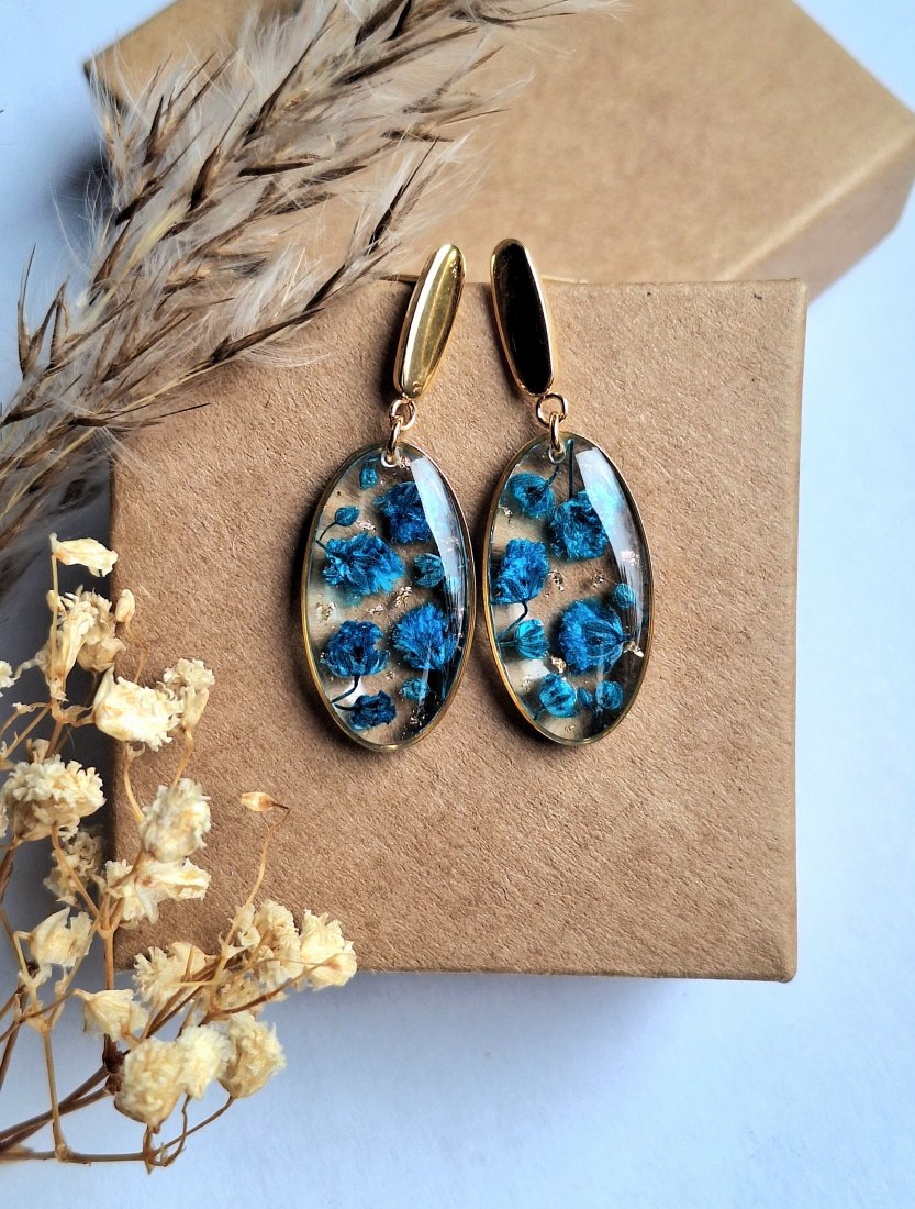 Urocze kolczyki z zatopionymi kwiatami i płatkami złota. Wykonane z wysokiej klasy żywicy, która nie zmienia koloru pod wpływem promieniowania uv oraz wysokiej jakości stali chirurgicznej.