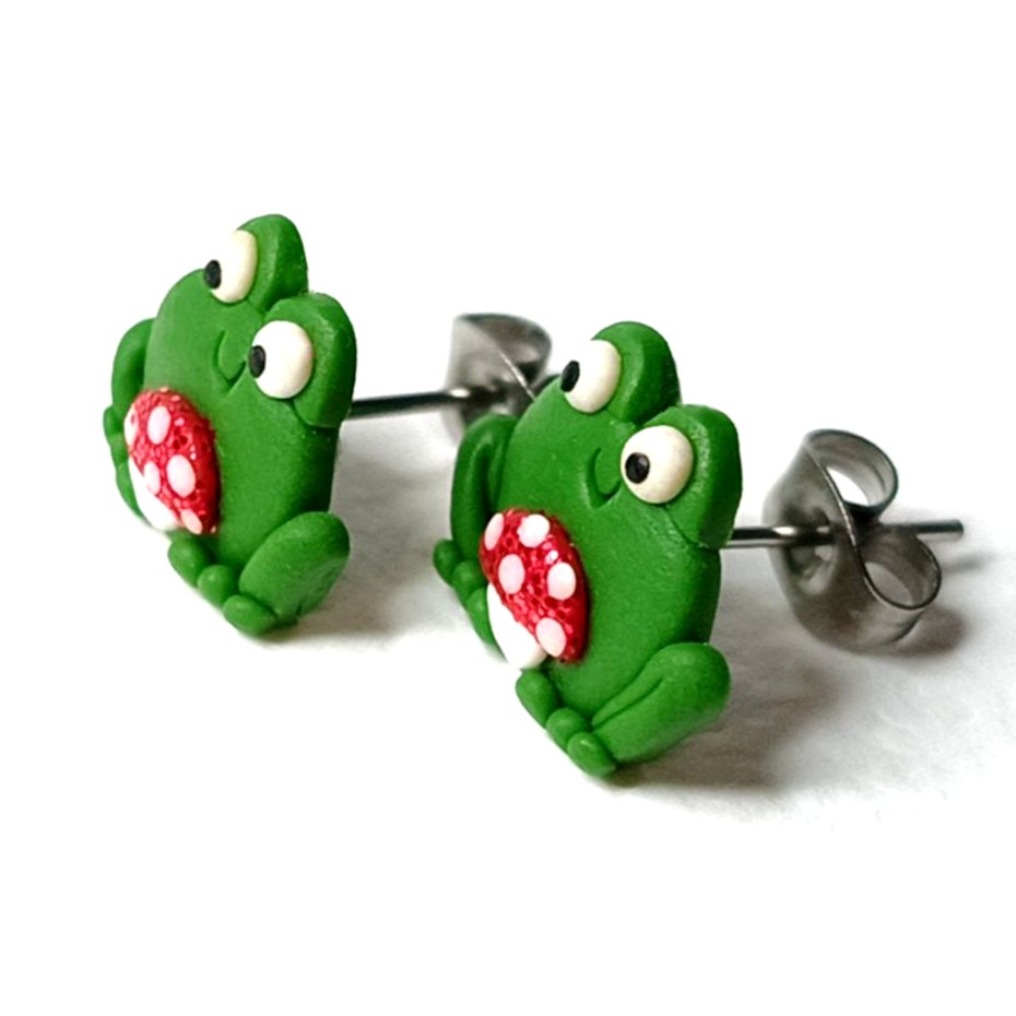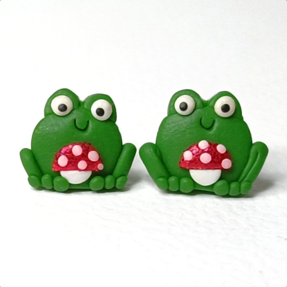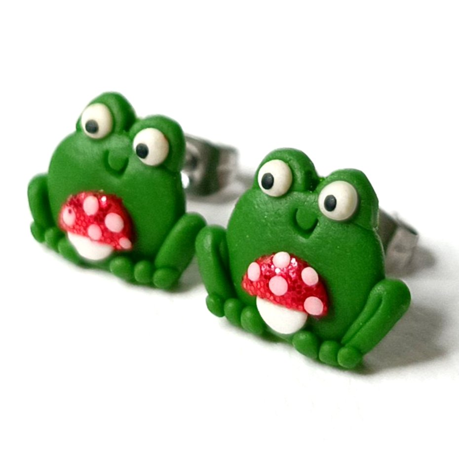 Urocze kolczyki sztyfty w kształcie zielonych żabek trzymających czerwone muchomorki. Ręcznie wykonane z masy polimerowej, zachwycają detalem i lekką, bajkową formą.