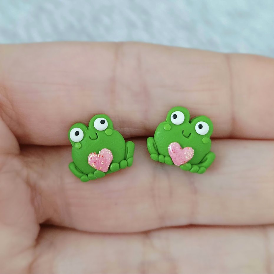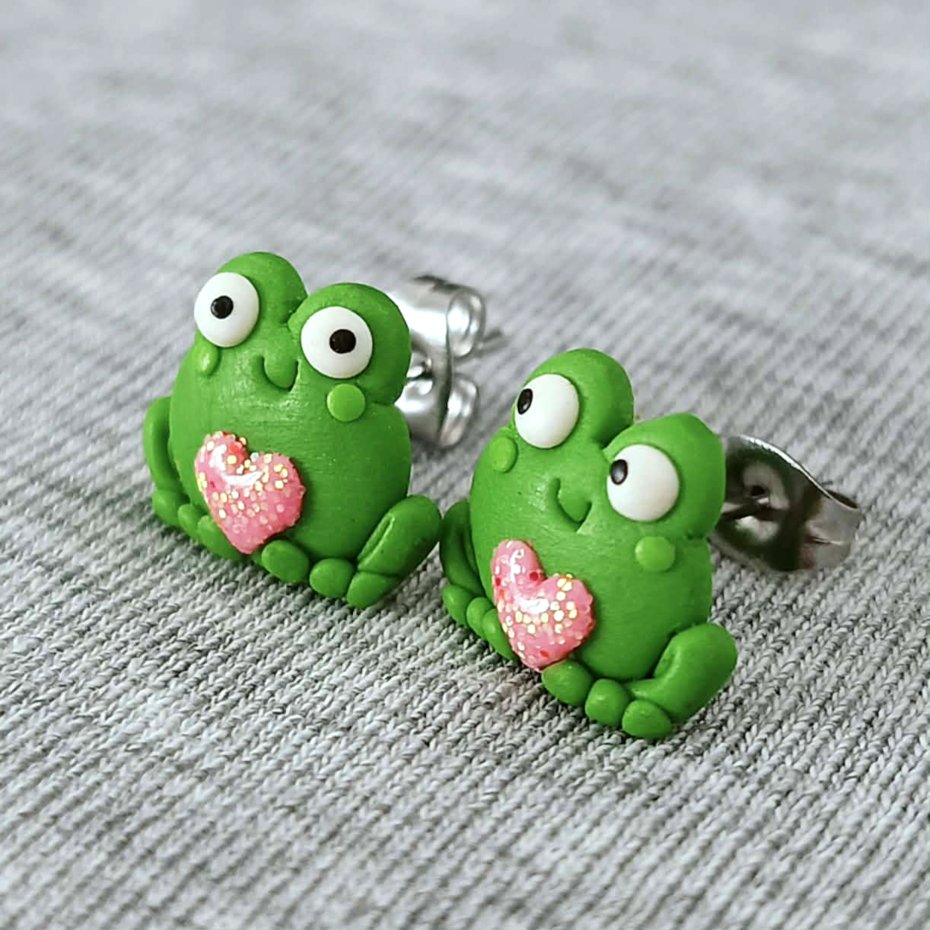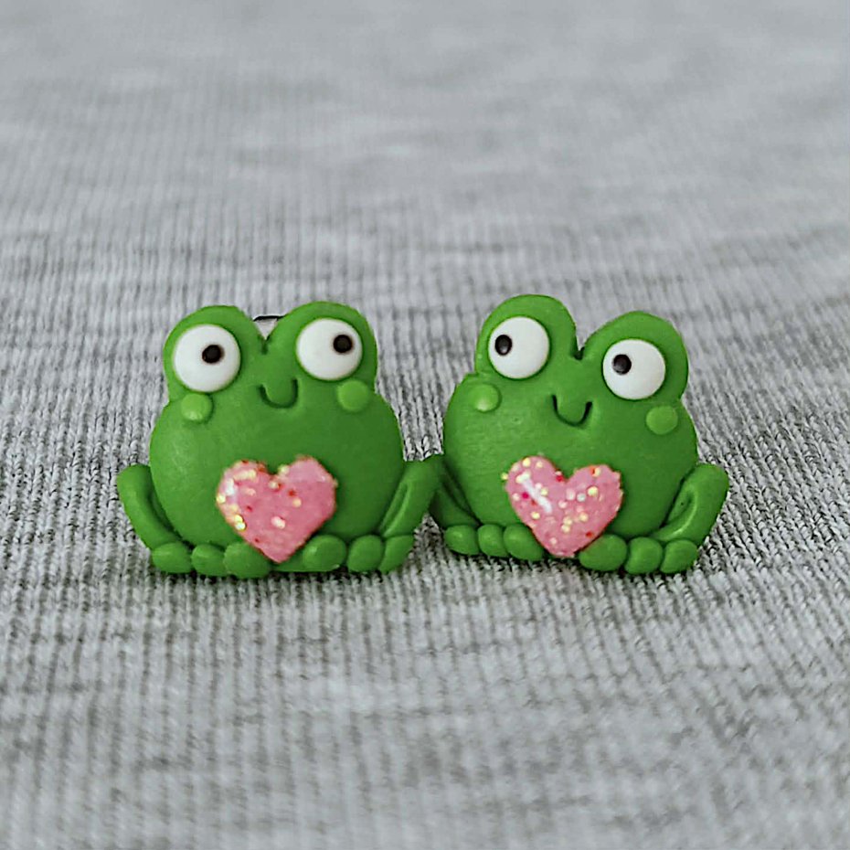 Urocze kolczyki sztyfty w kształcie zielonych żabek trzymających różowe serduszka. Ręcznie wykonane z masy polimerowej, zachwycają detalem i lekką, bajkową formą.