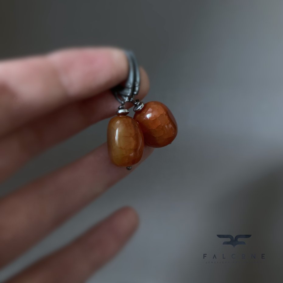Kolczyki ze srebra i kamieni. Bryłki agatu smoczego, z charakterystyczną siateczką żyłek i spękań, w kolorze ciepłego brązu, przypominające karmowa barwę miodu. Kamienie mają gładką, polerowaną powierzchnię. Na jednym z kamieni widoczna jest druza, która podkreśla ich naturalne pochodzi. Barwę kamieni podkreśla oprawa ze srebra. Bigle angielskie ze srebra 925. Średnica kamieni to 10/12 mm. Długość kolczyków to ok. 4 cm.