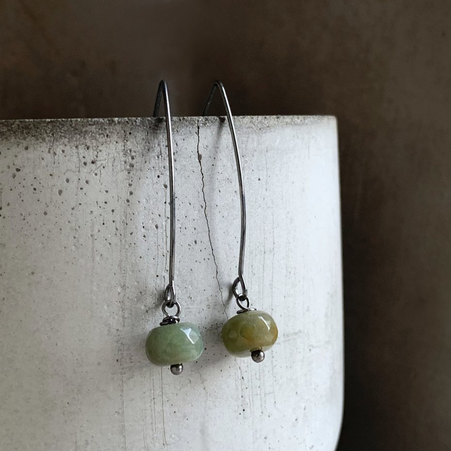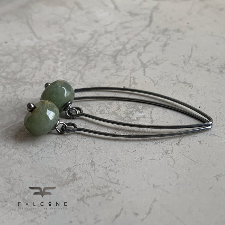 Kolczyki ze srebra i kamieni. Agat indyjski w formie oponek, o unikalnej barwie. Kolor kamieni to ziemista zieleń z domieszką mlecznej szarości, w połączeniu z ciepłymi nutami beżu. W zależności od ułożenia kamieni ich barwa się zmienia. Kolczyki zawieszone na efektownych, długich biglach. Bigle otwarte typu rybki ze srebra 925. Średnica kamieni to ok. 8 mm. Długość kolczyków to ok. 4 cm. Pojedynczy egzemplarz.
