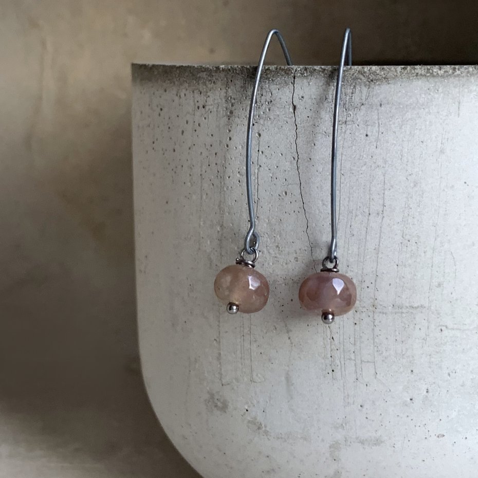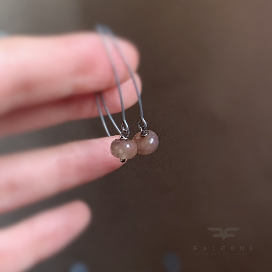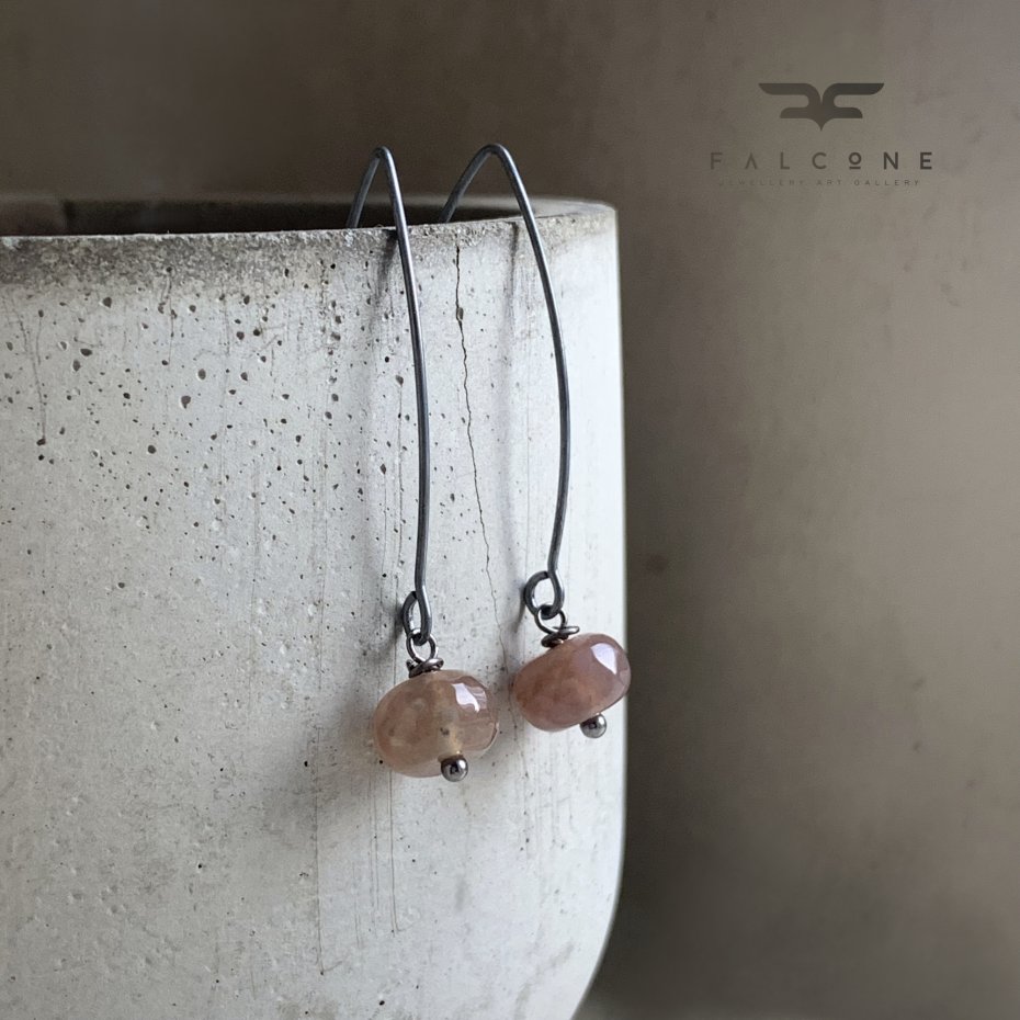 Kolczyki ze srebra i kamieni. Agat indyjski w formie oponek, o unikalnej barwie. Kolor kamieni to brudny, "bagnisty" róż, z domieszką brązu i beżu. Całość dopełniają długie, efektowne bigle z oksydowanego srebra. Bigle otwarte typu rybki ze srebra 925. Średnica kamieni to ok. 8 mm. Długość kolczyków to ok. 4 cm. Pojedynczy egzemplarz.