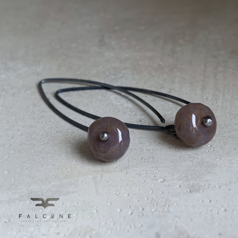 Kolczyki ze srebra i kamieni. Agat indyjski w formie oponek. Kamienie o unikalnej barwie, dobierane w parę w pojedynczym egzemplarzu. Kolor kamieni to brudny, "bagnisty" ciemny róż, z domieszką brązu i szarości. Całość dopełniają długie, efektowne bigle z oksydowanego srebra. Bigle otwarte typu rybki ze srebra 925. Średnica kamieni to ok. 8 mm. Długość kolczyków to ok. 4 cm.