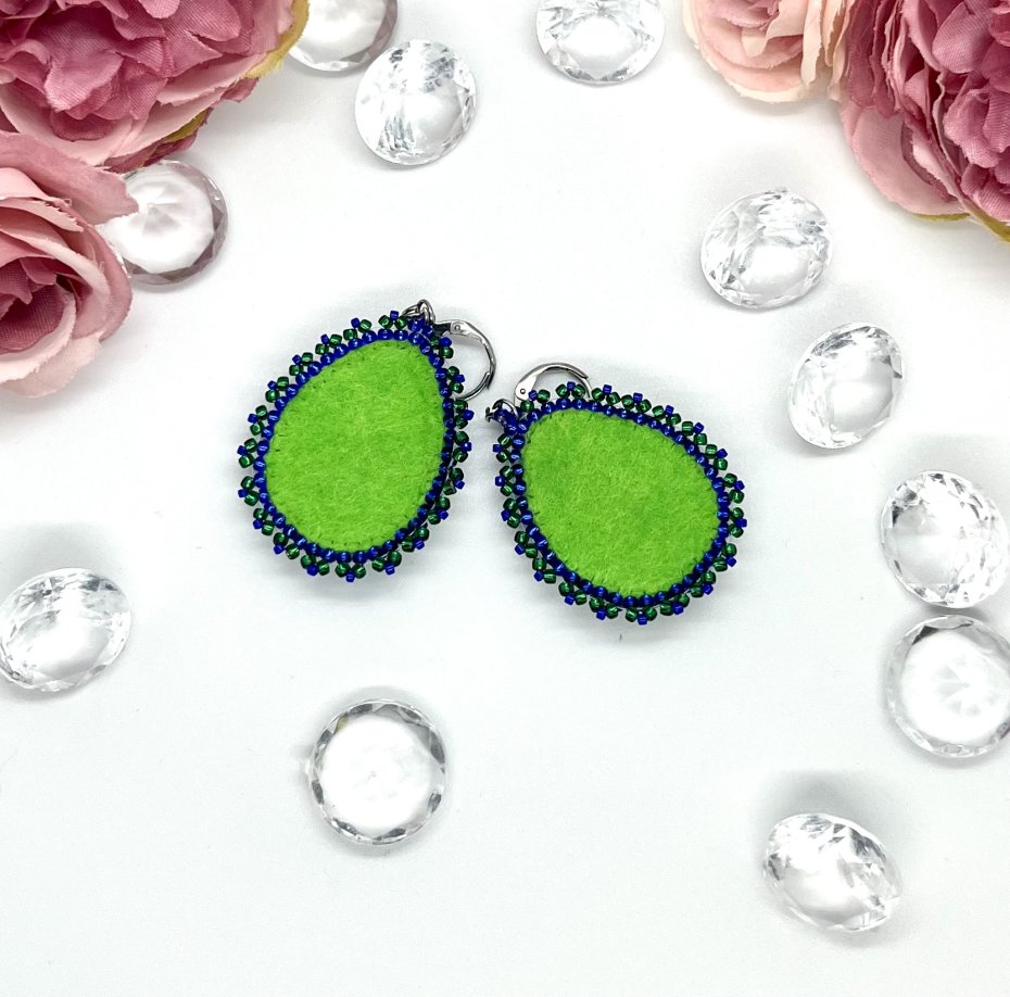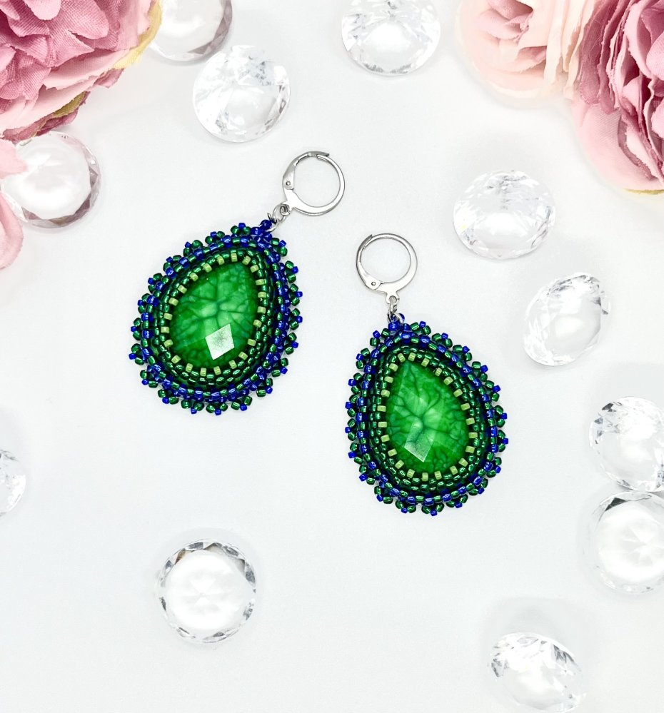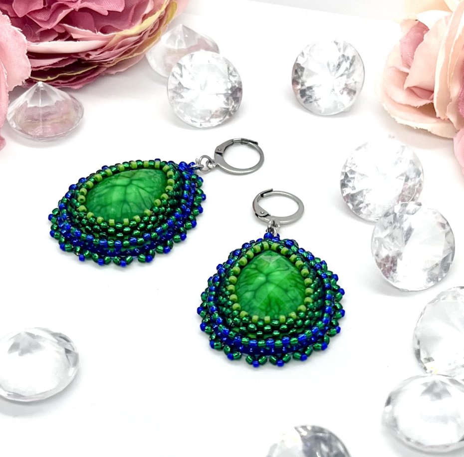 Przedstawiam ręcznie wykonane kolczyki "Zielona Magia"! Każda para przyciąga wzrok intensywnym, szmaragdowym kaboszonem z plastiku, który pięknie imituje naturalny kamień. Otoczony precyzyjnym haftem z koralików w odcieniach zieleni i granatu, tworzy unikalny, elegancki efekt.