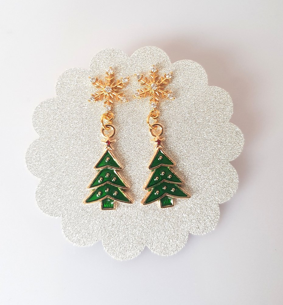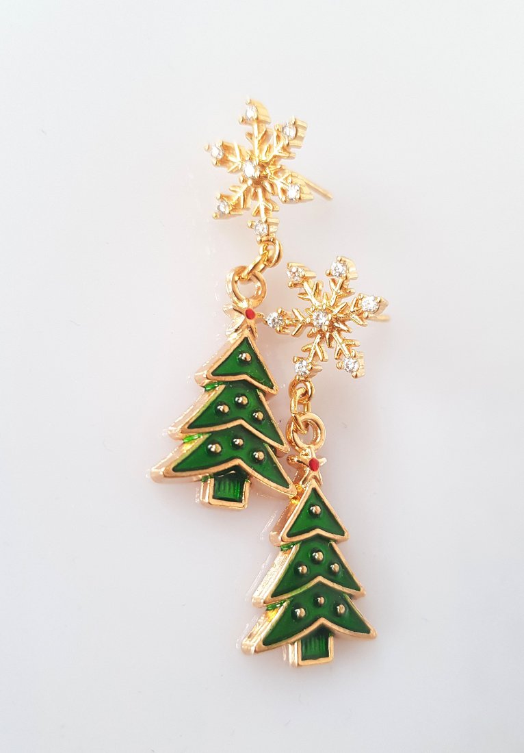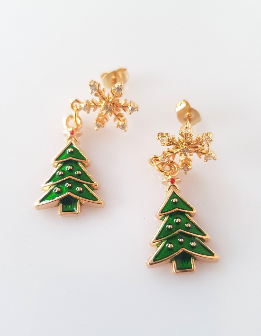 Śnieżynki wykonane z mosiądzu platerowanego złotem i cyrkonii, zawieszka choinka z metalu.