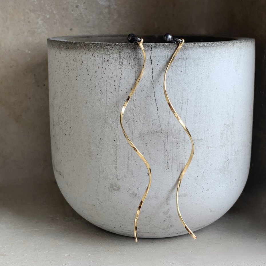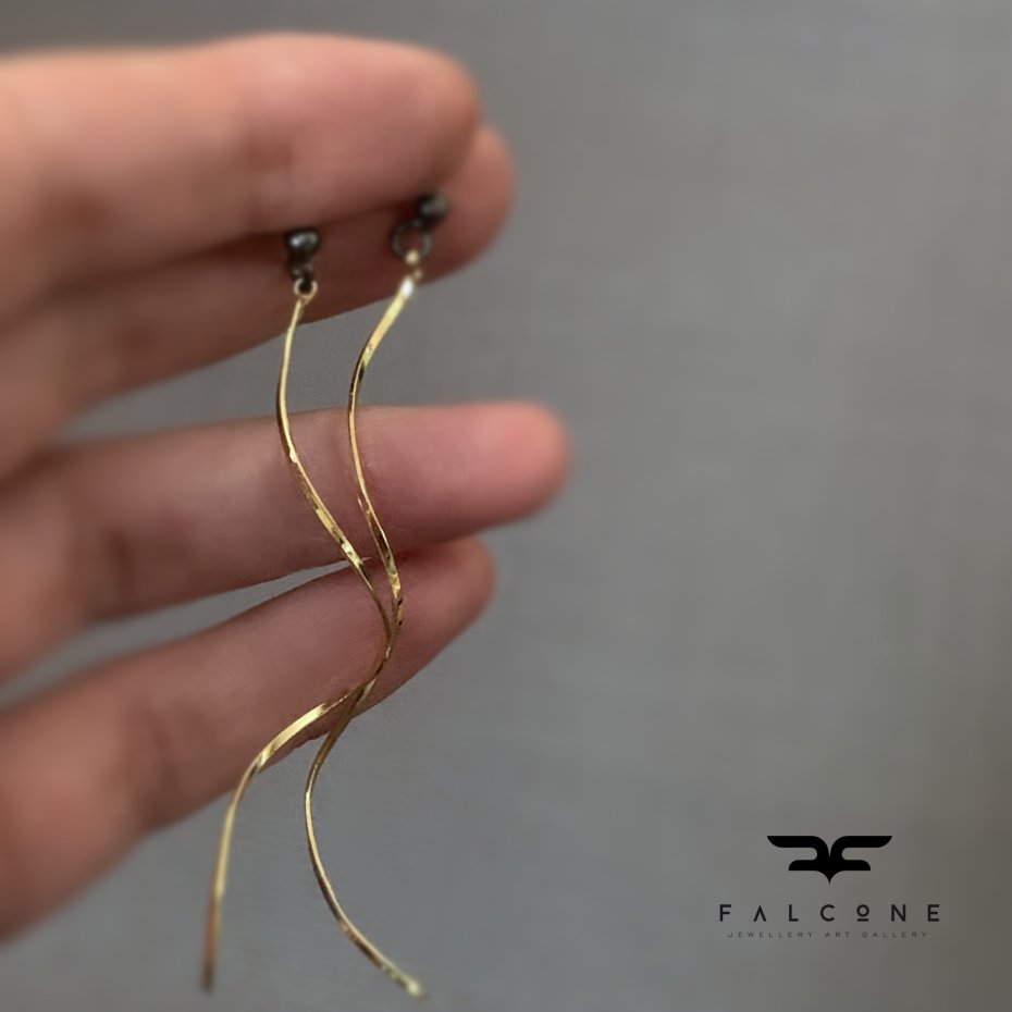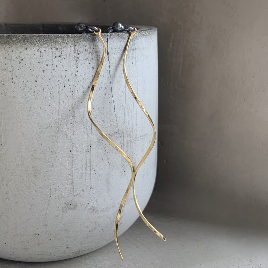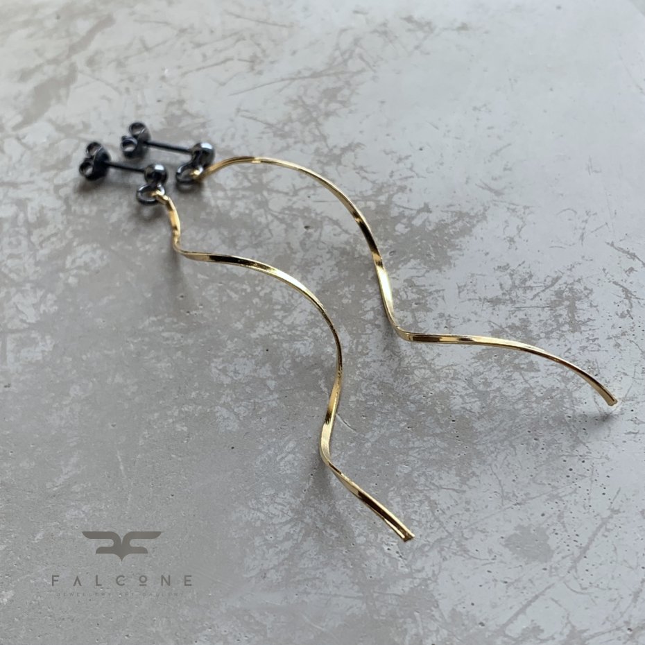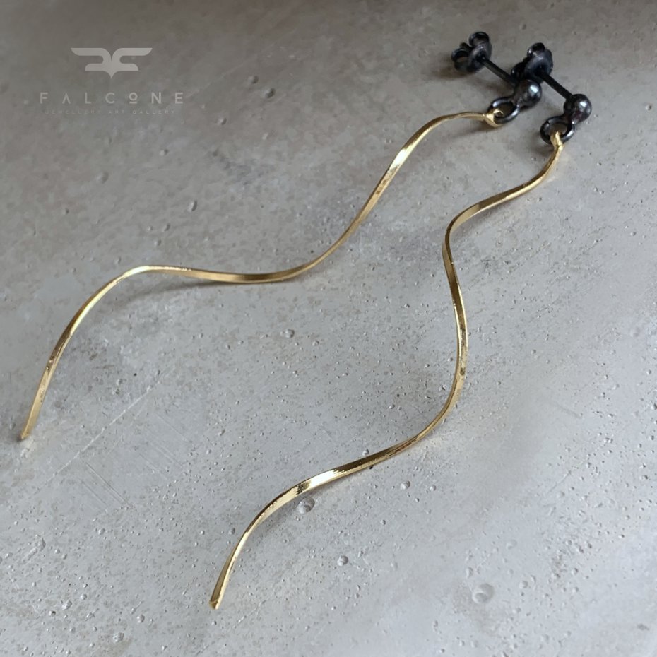 Kolczyki ze srebra i złoconego mosiądzu. Eleganckie, subtelne kolczyki w postaci długich spirali połyskujących złotem. Kolczyki mają nieregularną, falistą formę. Zawieszone na ciemnych srebrnych biglach Bigle typu sztyfty ze srebra 925. Długość kolczyków to ok. 7.5 cm.