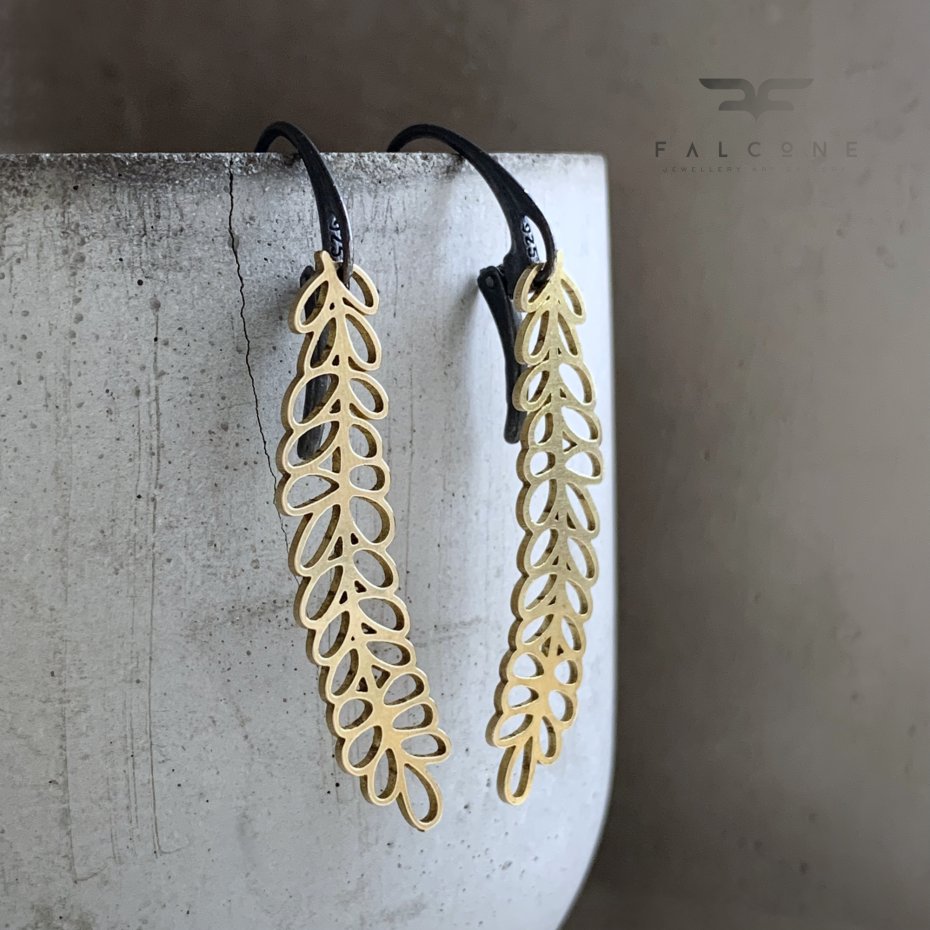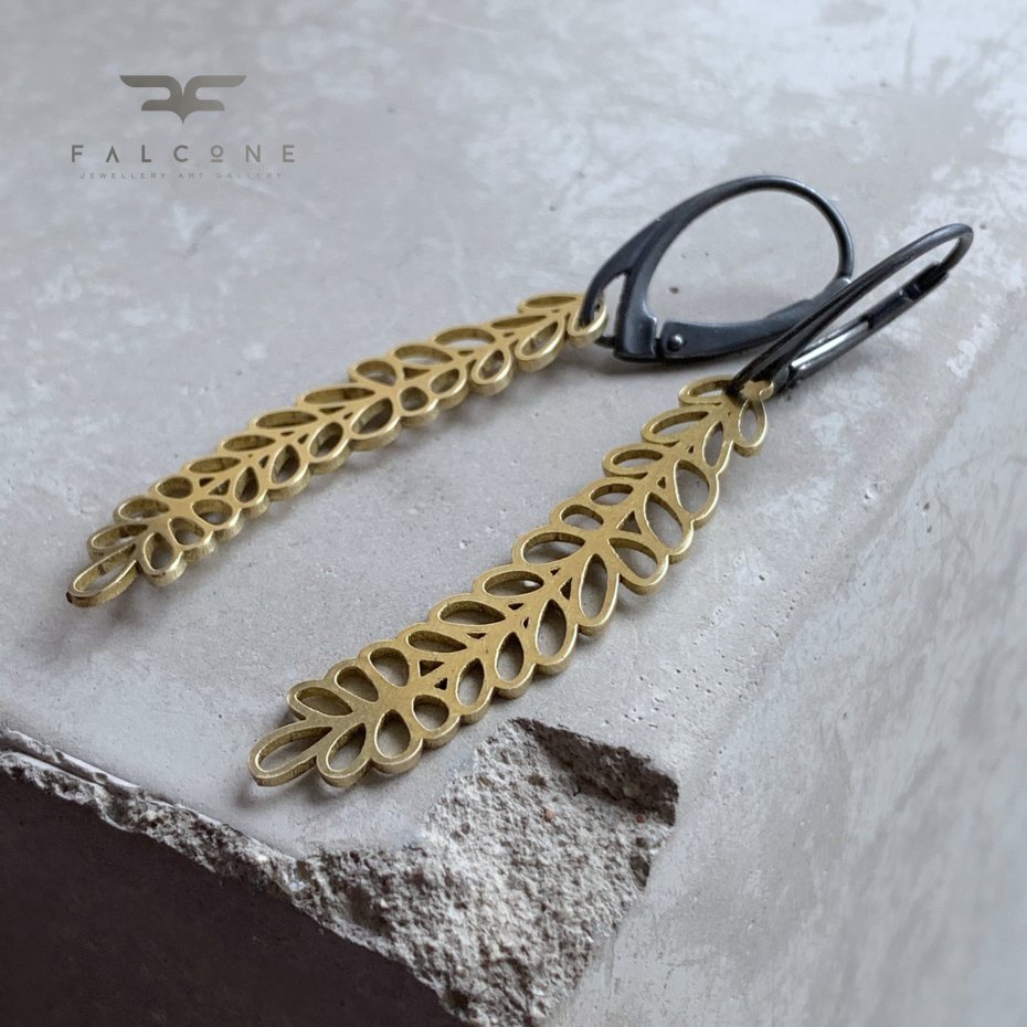 Kolczyki ze srebra i mosiądzu. Kolczyki łączące naturę z nowoczesnością w subtelnej formie efektownych, ażurowych kłosów z mosiądzu w kolorze złota. Charakter kolczyków podkreślają bigle z oksydowanego srebra. Bigle angielskie ze srebra 925. Długość kolczyków to ok. 5 cm.