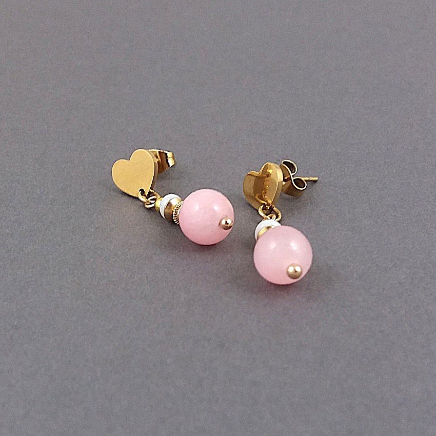 Delikatne, bardzo twarzowe kolczyki z nieuczulającej, pozłacanej stali szlachetnej. Na pięknie błyszczących sztyftach serduszkach zawieszone są gładkie kulki z blado różowego jadeitu, o średnicy 8mm i oponki białego agatu, o średnicy 6mm.