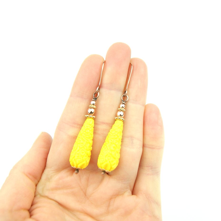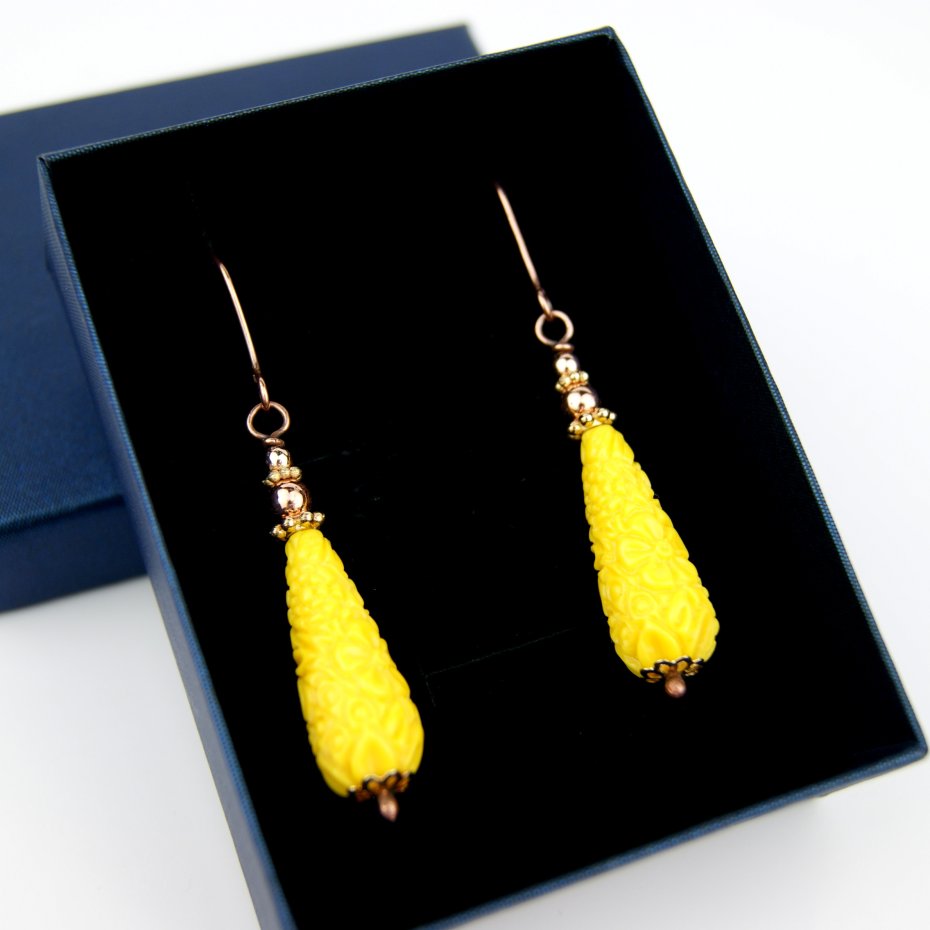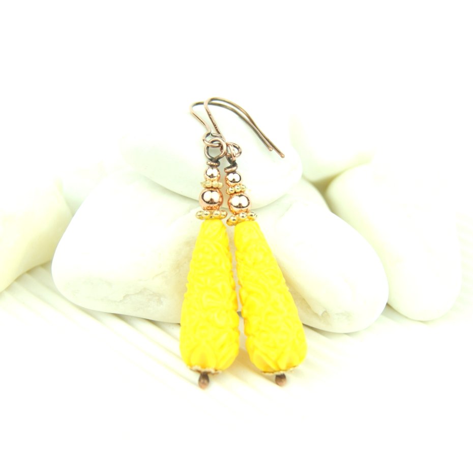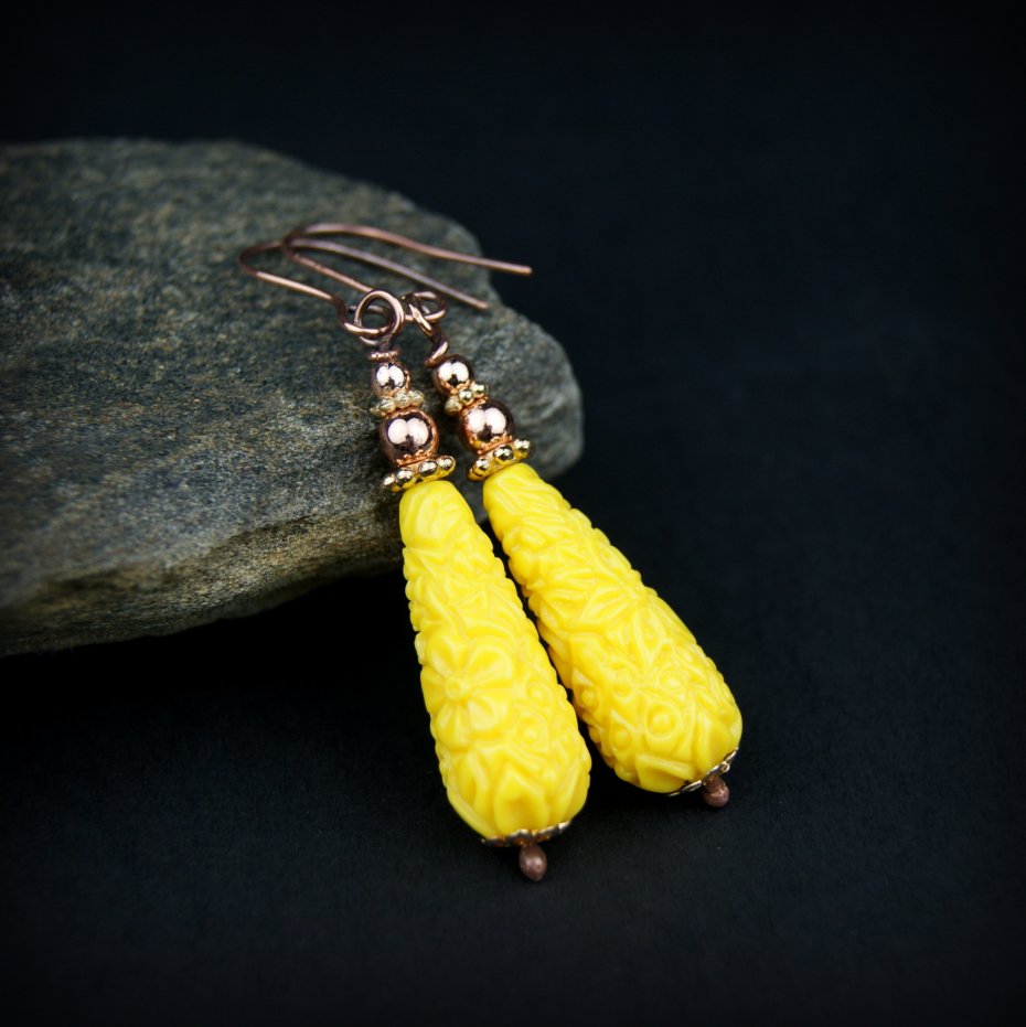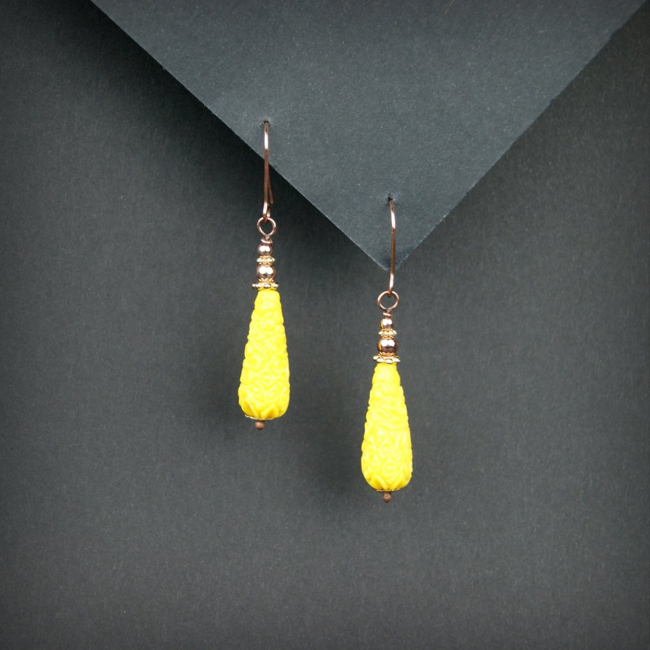 Kolczyki powstały z żółtych kamieni w kształcie rzeźbionej kropli, powstałych ze zmielonych kamieni półszlachetnych, a także złotych hematytów. Bigle miedziane. Kolczyki lekkie